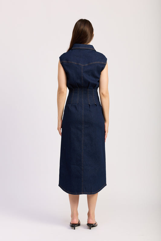 INDIGO DENIM VEST MIDI DRESSPrecio habitual $115.00 USDPrecio habitualPrecio unitario por-