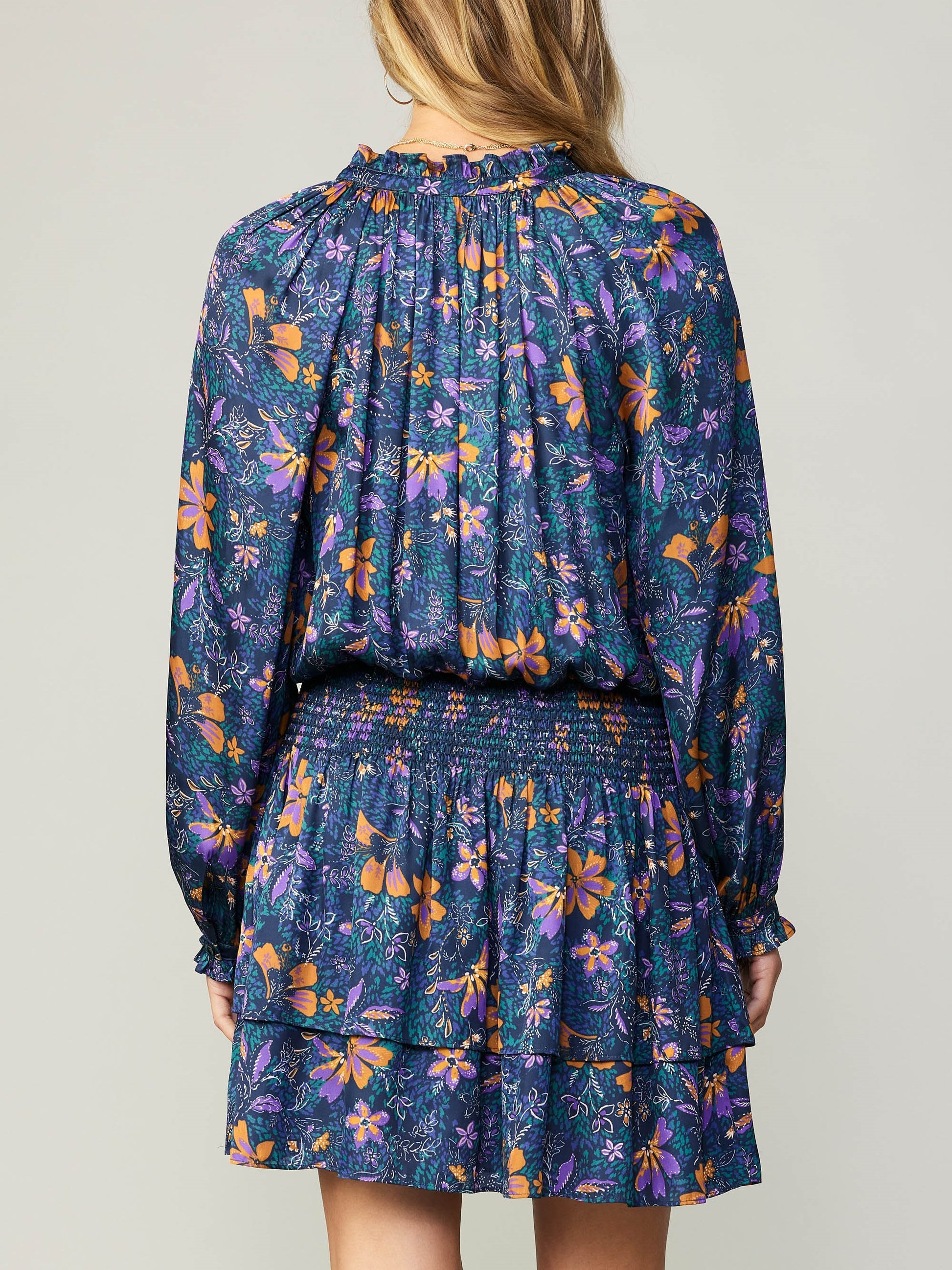Vestido corto estampado con flores en tonos morado, naranja y verde sobre fondo azul marino. Cuenta con escote en “V” con volantes y cordones decorativos, mangas largas abullonadas con puño fruncido y cintura elástica tipo nido de abeja. La falda presenta diseño en capas con vuelo, ideal para un look bohemio y femenino.