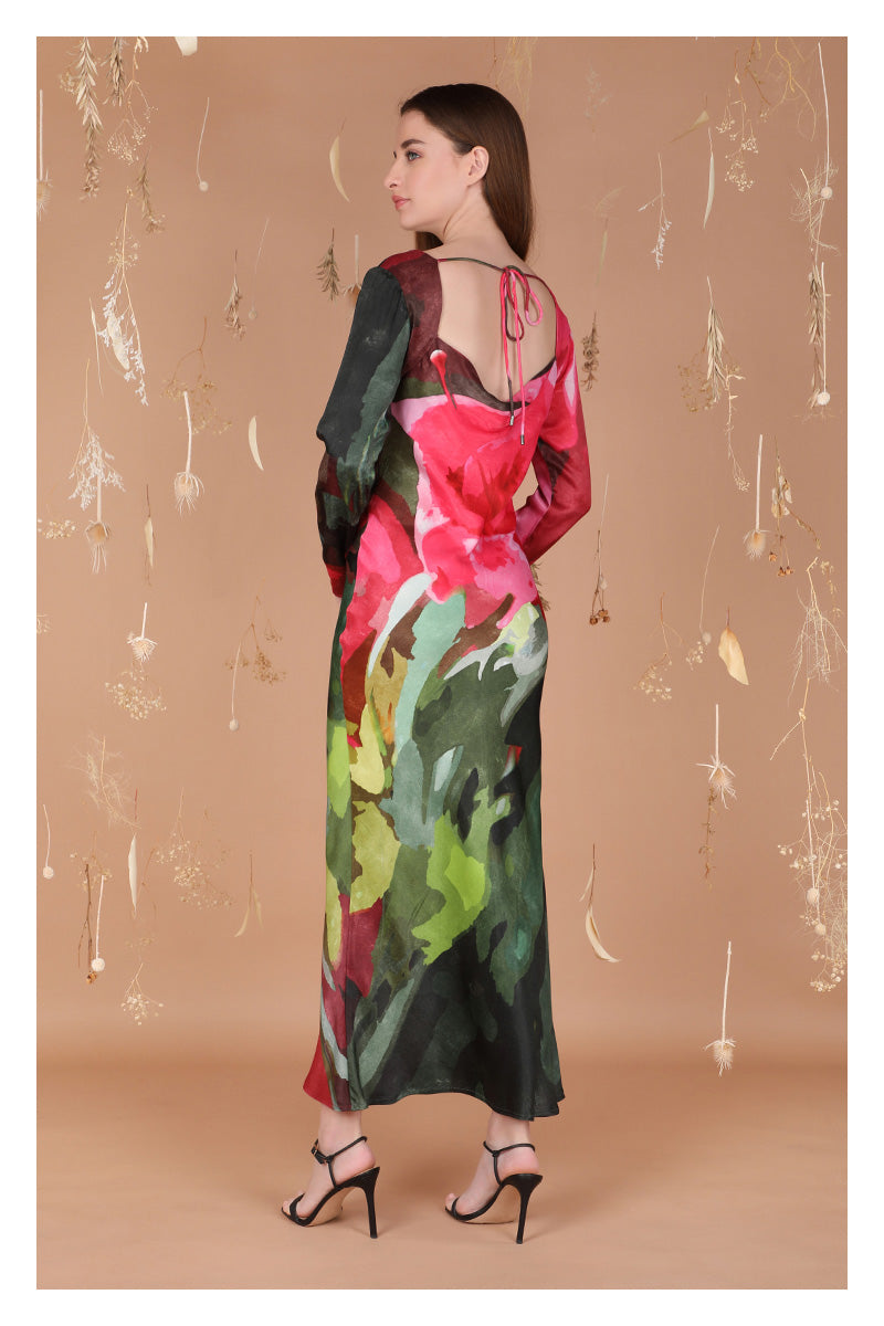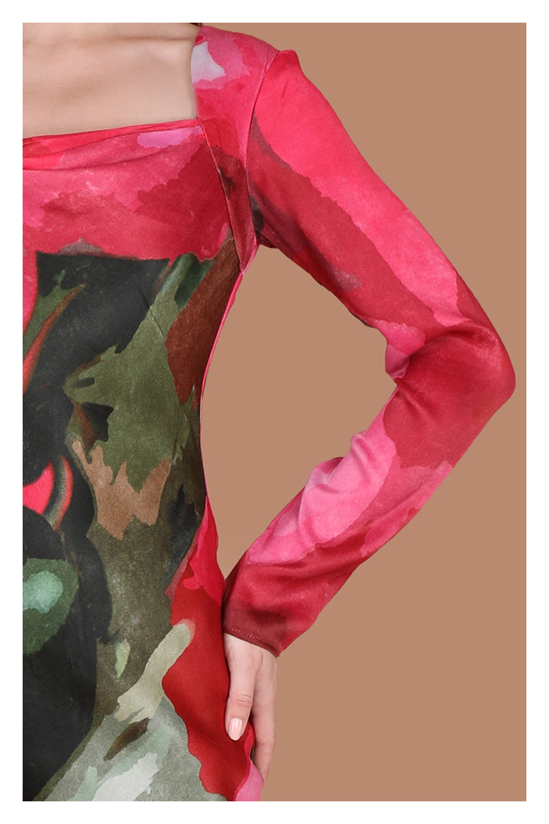 Vestido midi con estampado abstracto en tonos vibrantes como rojo, verde, negro y fucsia. Tiene escote amplio en forma de corazón con caída suave y mangas largas. La silueta es ajustada al cuerpo, favoreciendo la figura con un toque artístico y sofisticado. Ideal para eventos especiales o cenas elegantes.