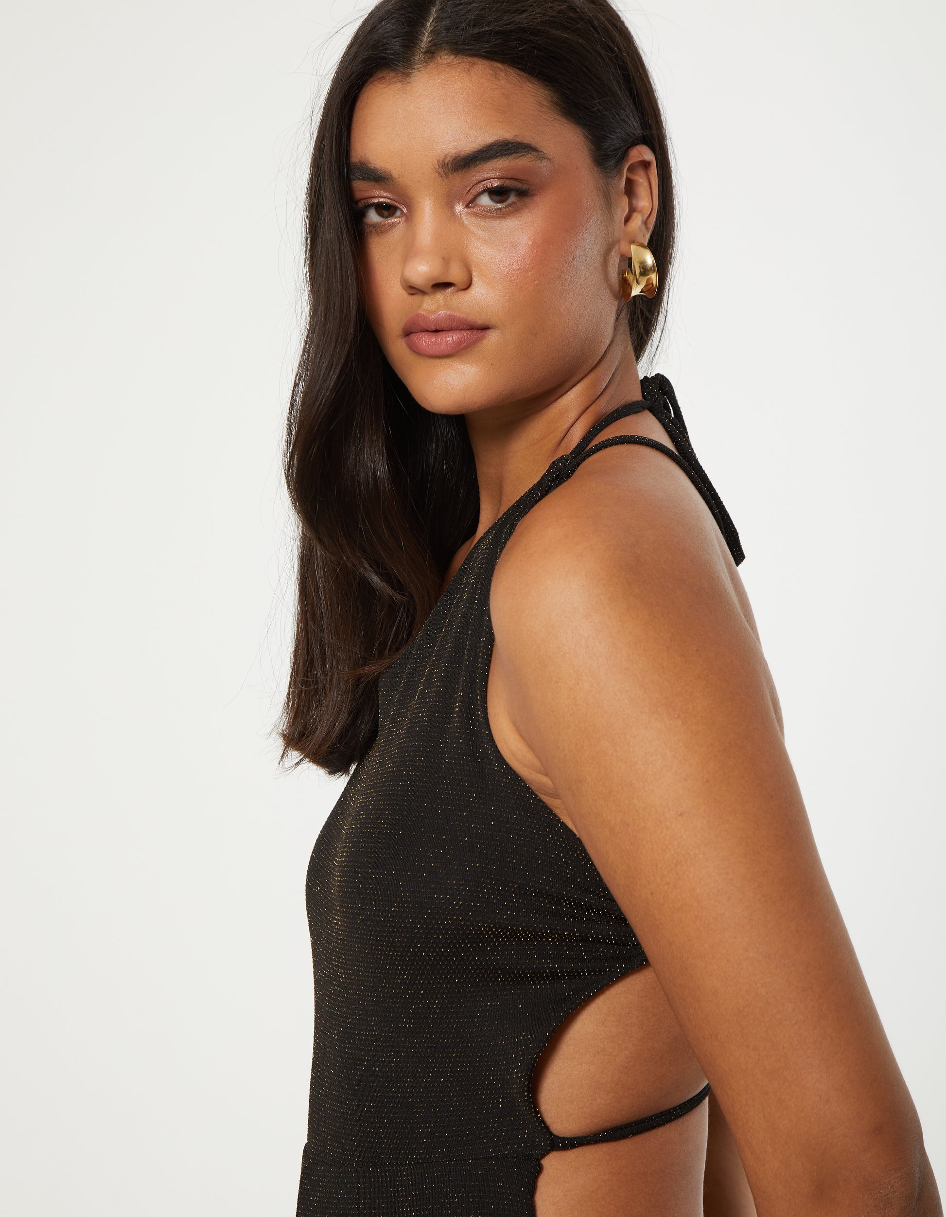 Enterizo tipo culotte en tejido negro con sutil brillo, ideal para ocasiones nocturnas. Presenta escote redondo, tirantes anchos y aberturas laterales que se ajustan con tiras finas en la espalda. El corte amplio en las piernas aporta movimiento y modernidad. Perfecto para destacar con elegancia y comodidad.