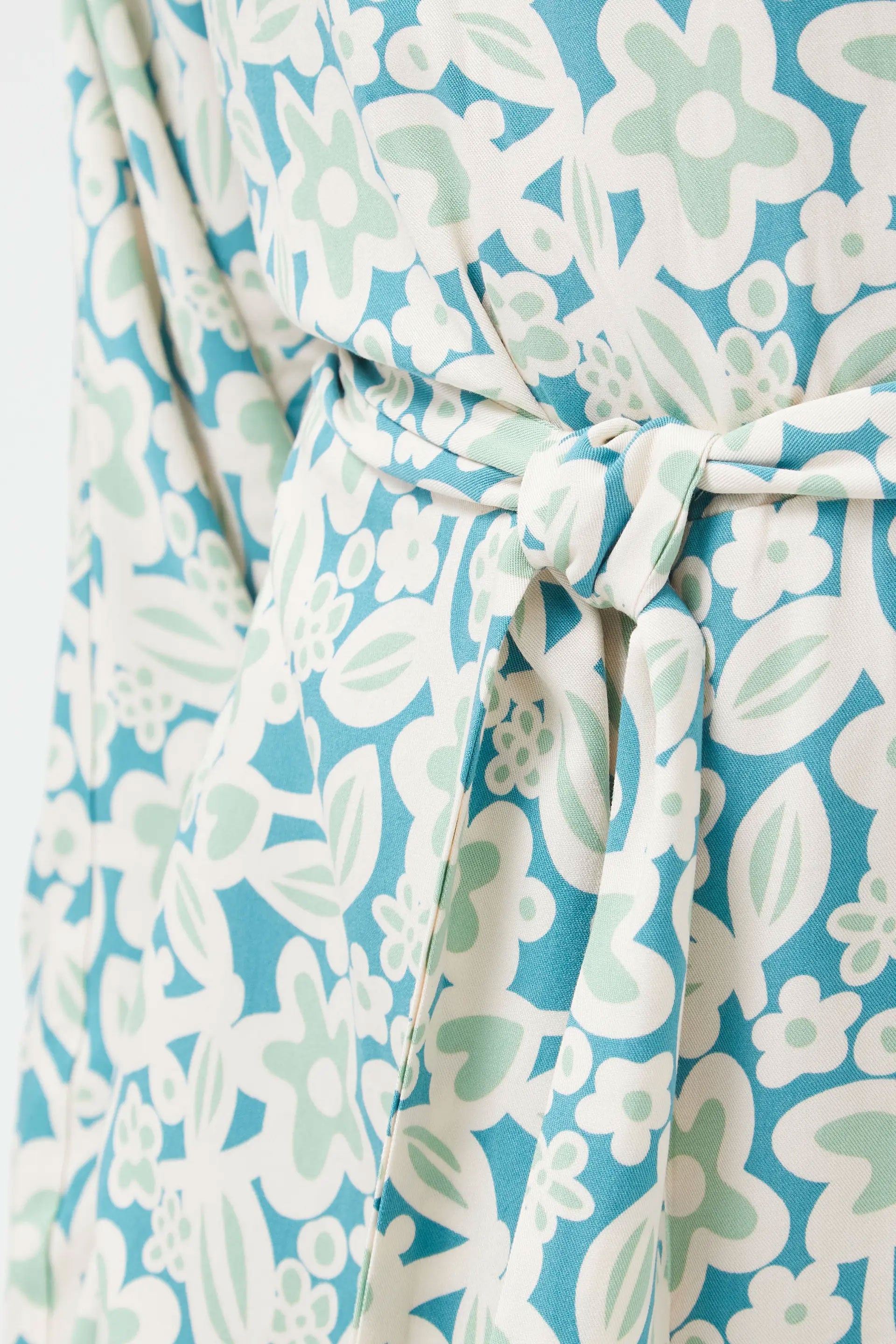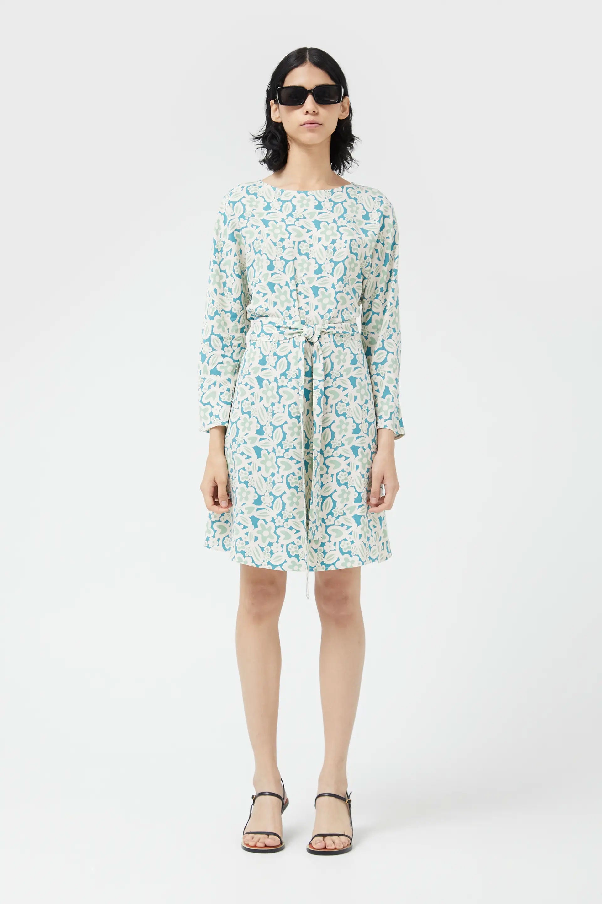 Vestido corto con estampado floral en tonos verde menta, blanco y azul claro. De silueta recta y manga larga, cuenta con escote barco y cinturón del mismo tejido para ajustar la cintura. Confeccionado en tela liviana, es ideal para un look fresco, cómodo y con un aire retro.