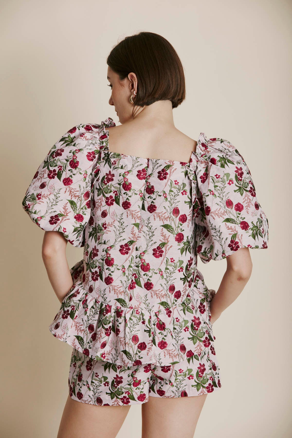 Blusa de algodón con estampado floral en tonos magenta, verde y rosa sobre fondo claro. Presenta escote cuadrado y mangas abullonadas con detalle fruncido en los hombros. La silueta peplum con volantes añade un toque romántico y femenino, ideal para looks veraniegos o de día.