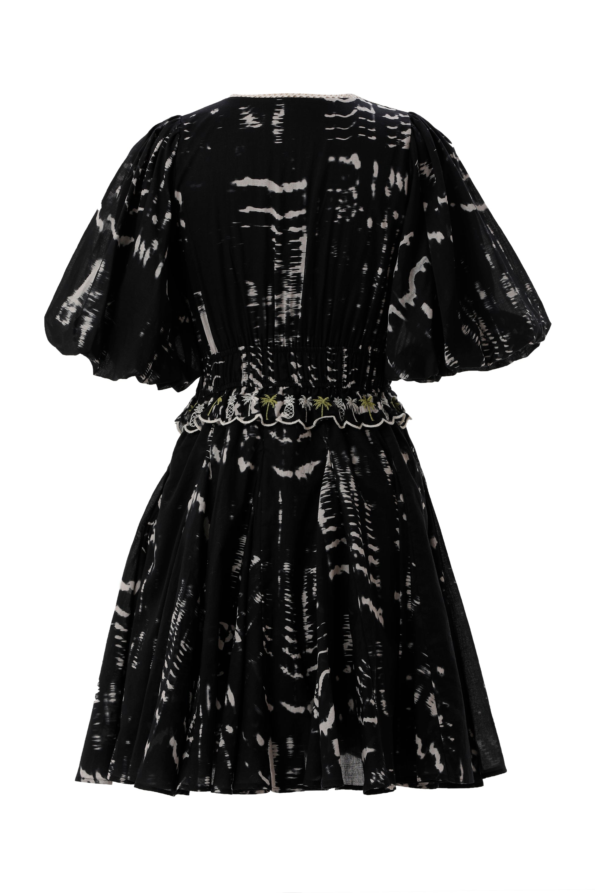 Vestido corto de algodón con estampado batik en blanco y negro, decorado con bordados tropicales en forma de piñas y palmeras en tonos blanco y verde. Cuenta con escote en V profundo, mangas abullonadas y cintura elástica con detalle de nido de abeja. Su silueta fluida lo hace ideal para un look fresco y bohemio.