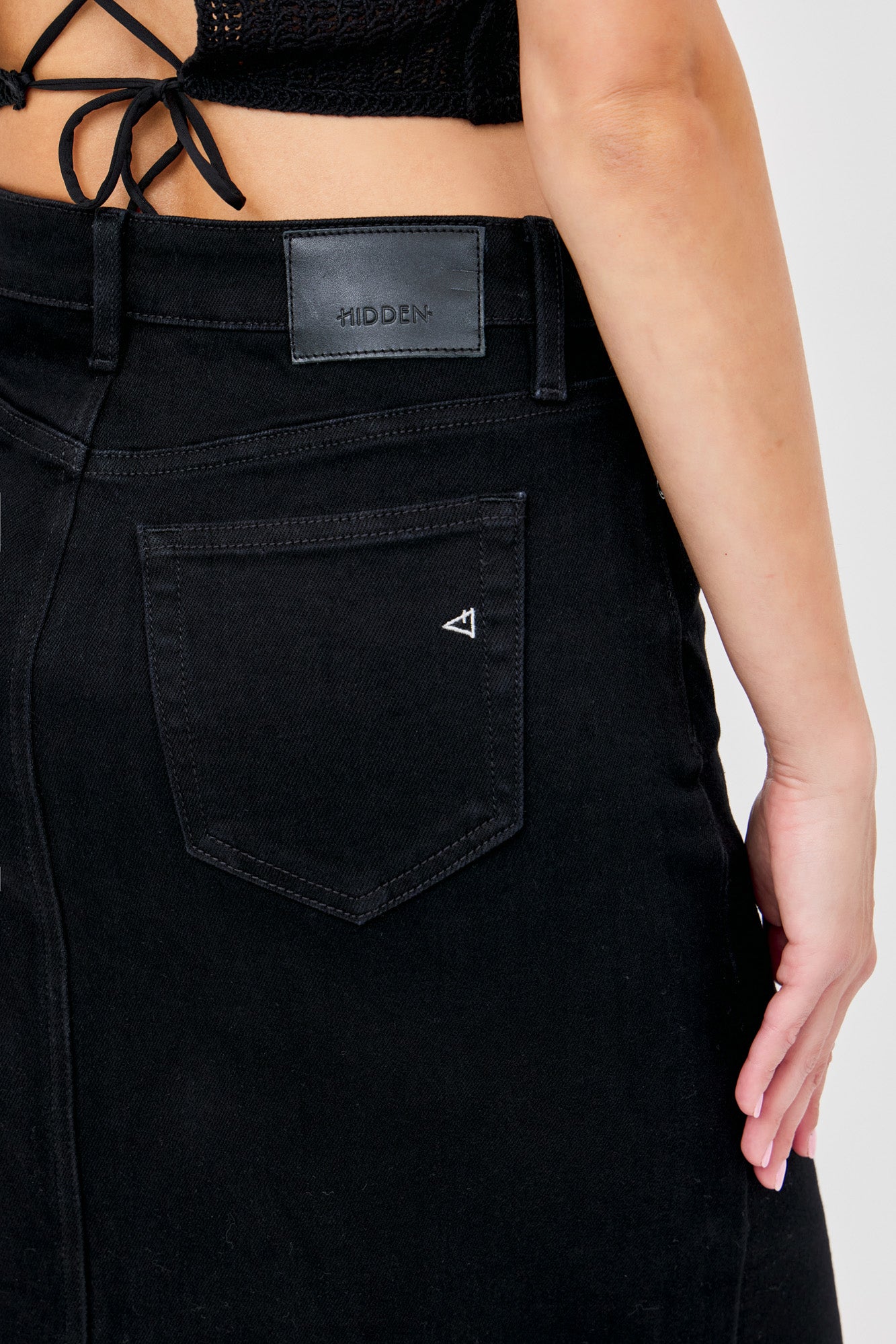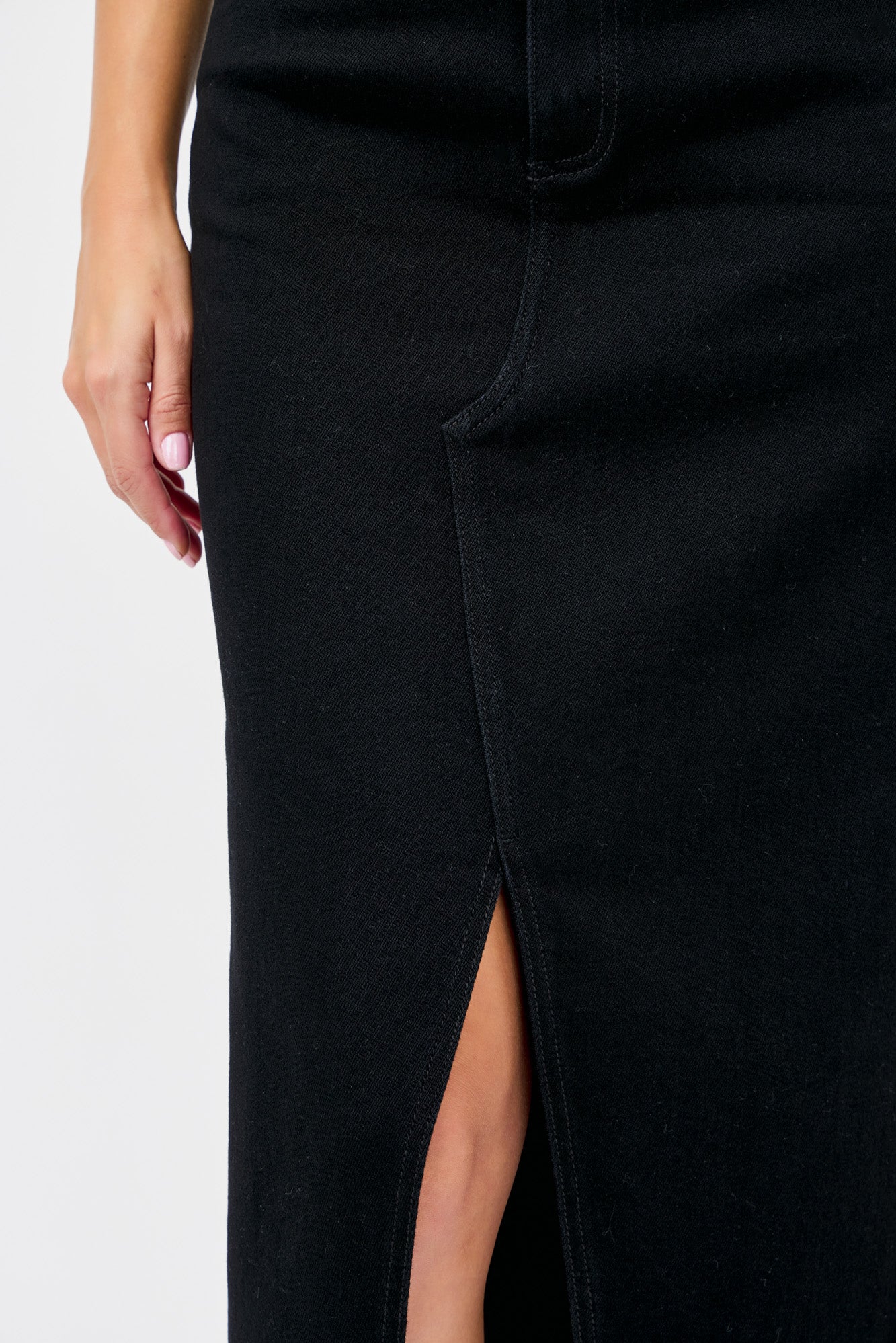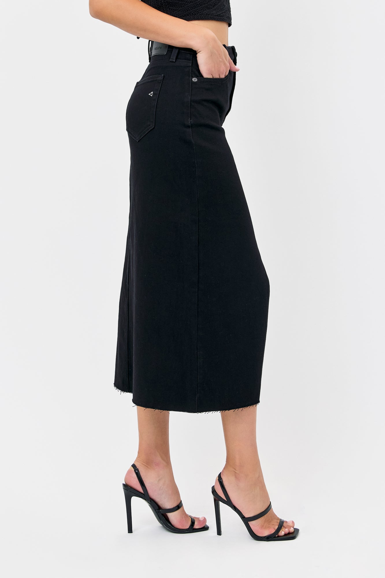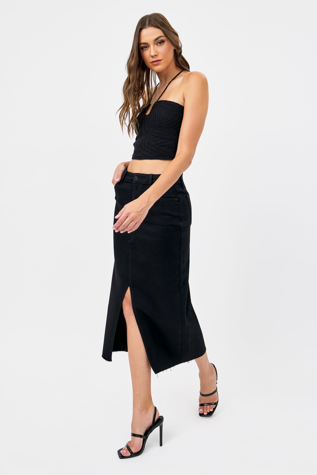 Falda midi negra de mezclilla con abertura frontal. Corte recto y cintura alta, con terminaciones deshilachadas en el bajo. Confeccionada en denim stretch de algodón y elastano, brinda estructura y comodidad. Ideal para looks urbanos o casuales.