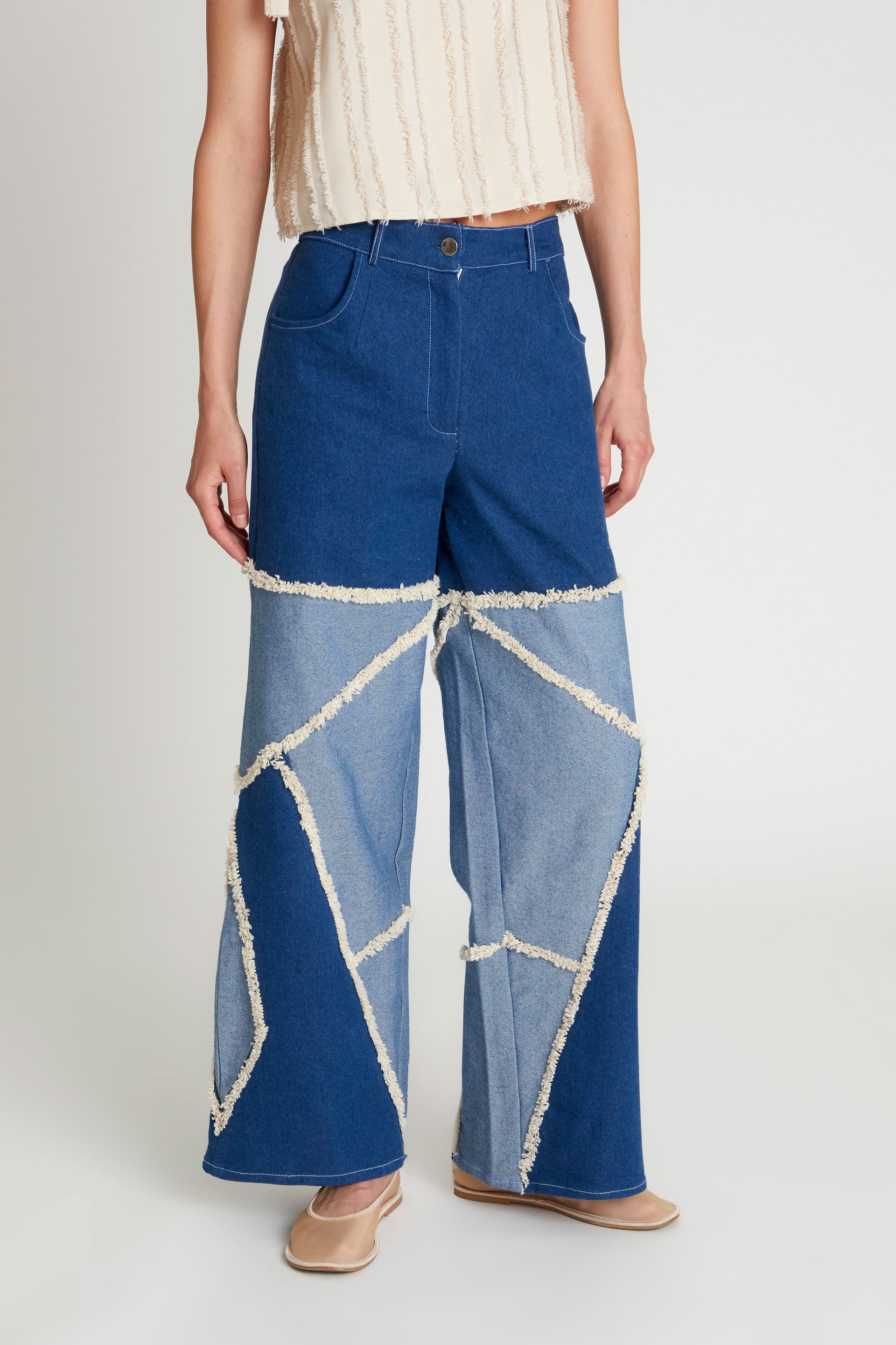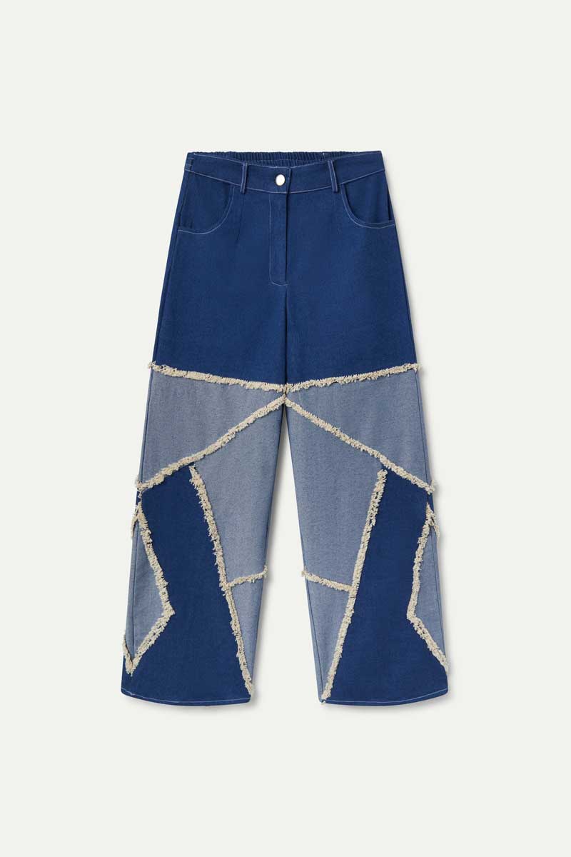 Pantalón denim patchwork bicolor. Diseño de tiro alto con corte recto y pernera ancha. Confeccionado en mezclilla de dos tonos con costuras deshilachadas en líneas geométricas que crean un efecto patchwork. Detalles de bolsillos delanteros, pretina con botón metálico y cierre oculto. Una pieza llamativa con inspiración retro.