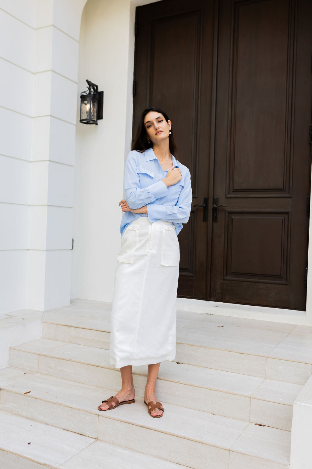 Falda larga en denim blanco de silueta recta. Presenta pretina ancha con presilla y cierre frontal, además de bolsillos delanteros tipo parche que aportan un aire utilitario. El largo midi y la estructura del tejido la hacen ideal para combinar con prendas casuales o más elevadas. Confeccionada en algodón con spandex para mayor comodidad.