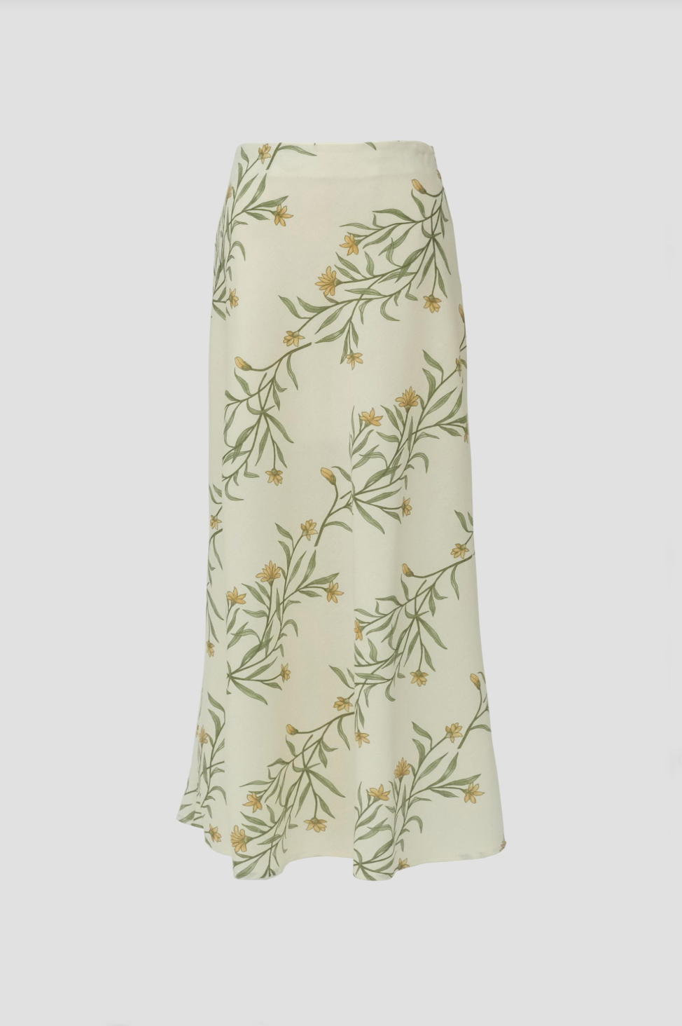 Falda larga estilo línea A con caída fluida. Estampado floral en tonos verdes y amarillos sobre fondo marfil. Pretina lisa a la cintura y cierre lateral oculto. Confeccionada en una tela ligera, ideal para climas cálidos. Combina perfectamente con su blusa a juego para un look coordinado y fresco.