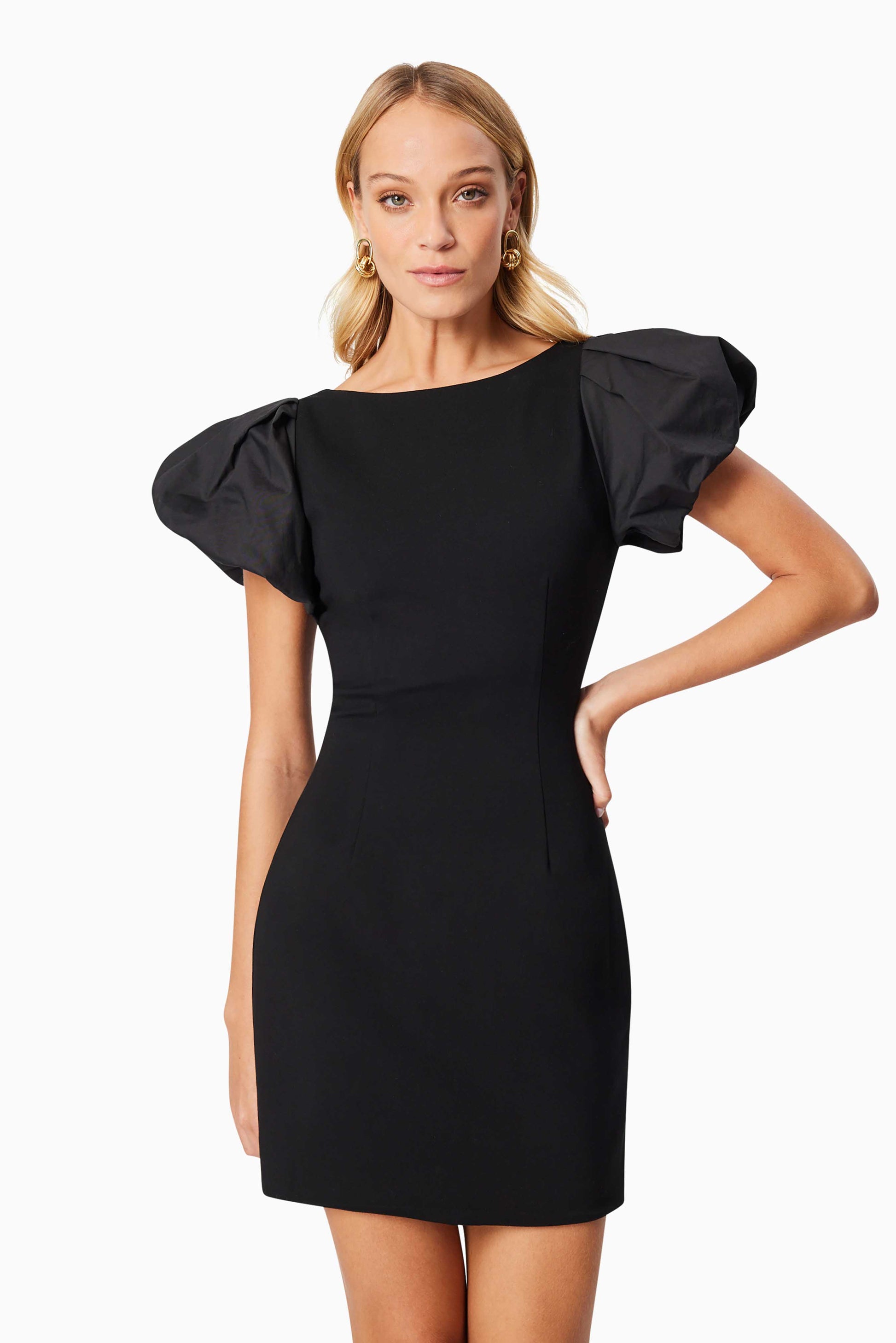 Vestido corto negro de silueta recta con mangas abullonadas tipo globo, que aportan volumen y sofisticación. Escote barco que realza los hombros, confeccionado en tejido estructurado con caída elegante. Perfecto para eventos formales o cenas especiales.