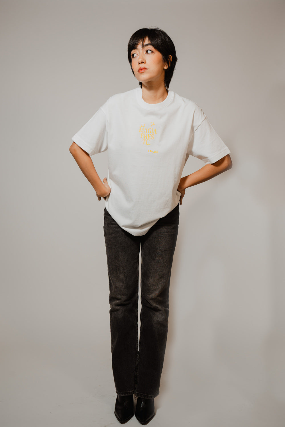 Playera blanca de algodón de corte relajado con estampado frontal en letras doradas que dice “La magia eres tú”. Diseño unisex y versátil, ideal para looks casuales y cómodos.
