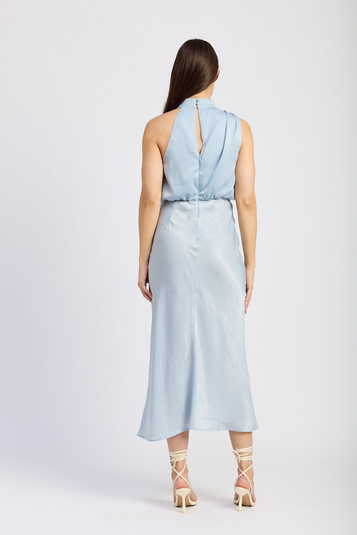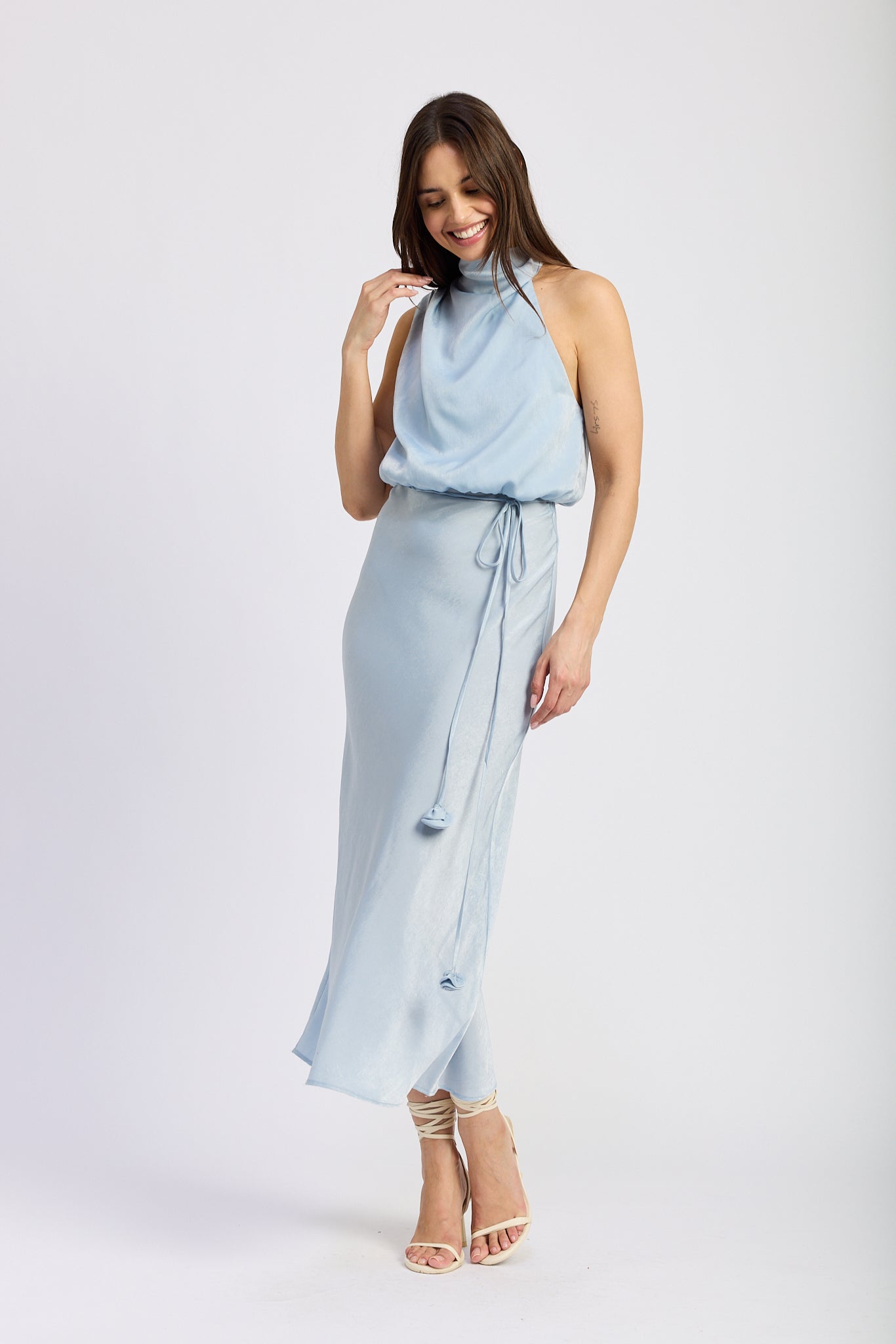 Vestido satinado en color celeste, de corte midi y estilo elegante. Presenta cuello halter con caída drapeada en el frente y espalda descubierta, ajustándose a la cintura con un cordón largo terminado en detalles de nudo. La falda es recta y fluida, ideal para un look sofisticado de noche o eventos especiales.