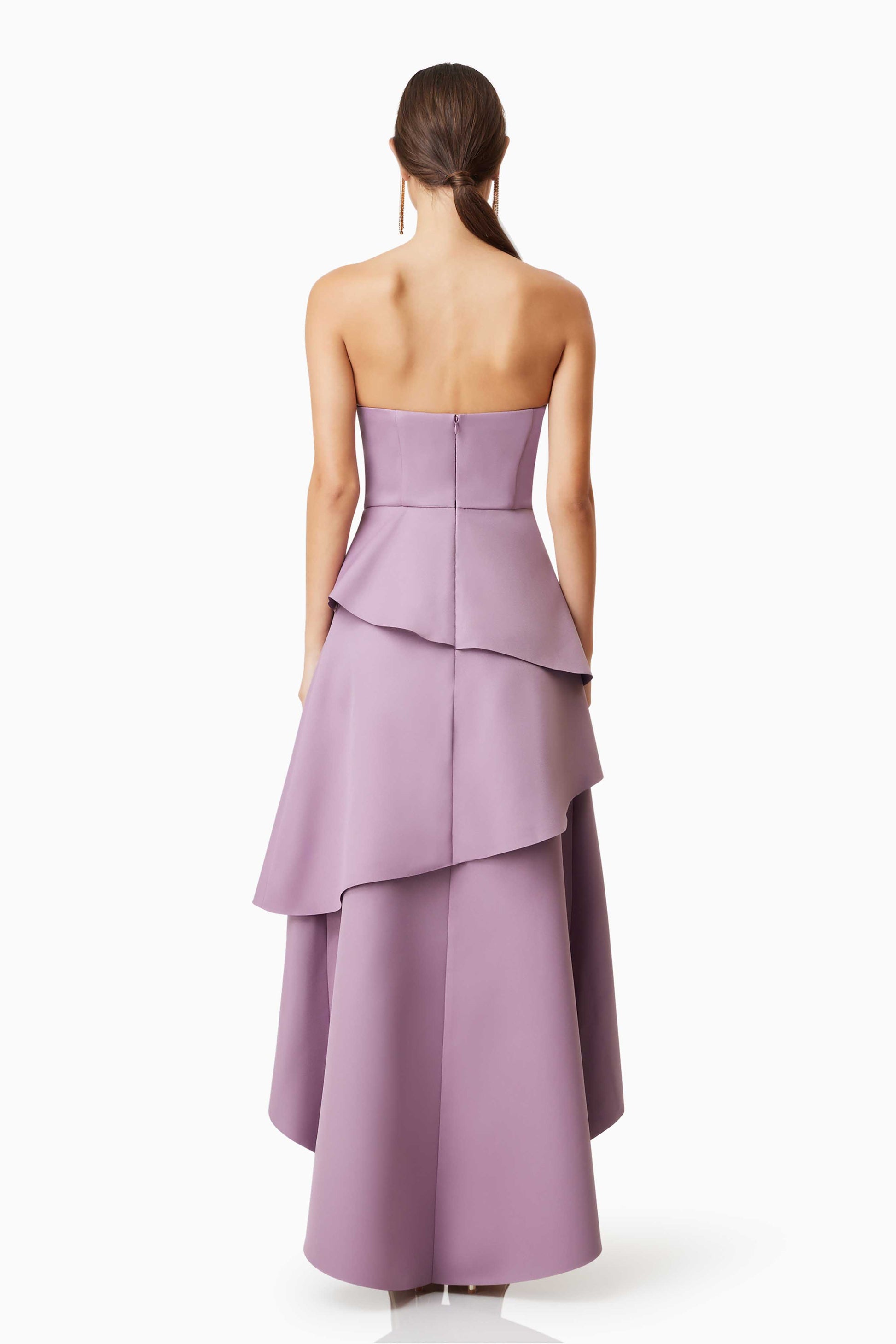 Vestido strapless color malva, con escote estructurado tipo corazón y pliegues decorativos en el busto. La falda presenta diseño asimétrico de capas tipo cascada que aporta volumen y movimiento. Confeccionado en tejido estructurado que mantiene la silueta. Ideal para eventos formales o de noche.