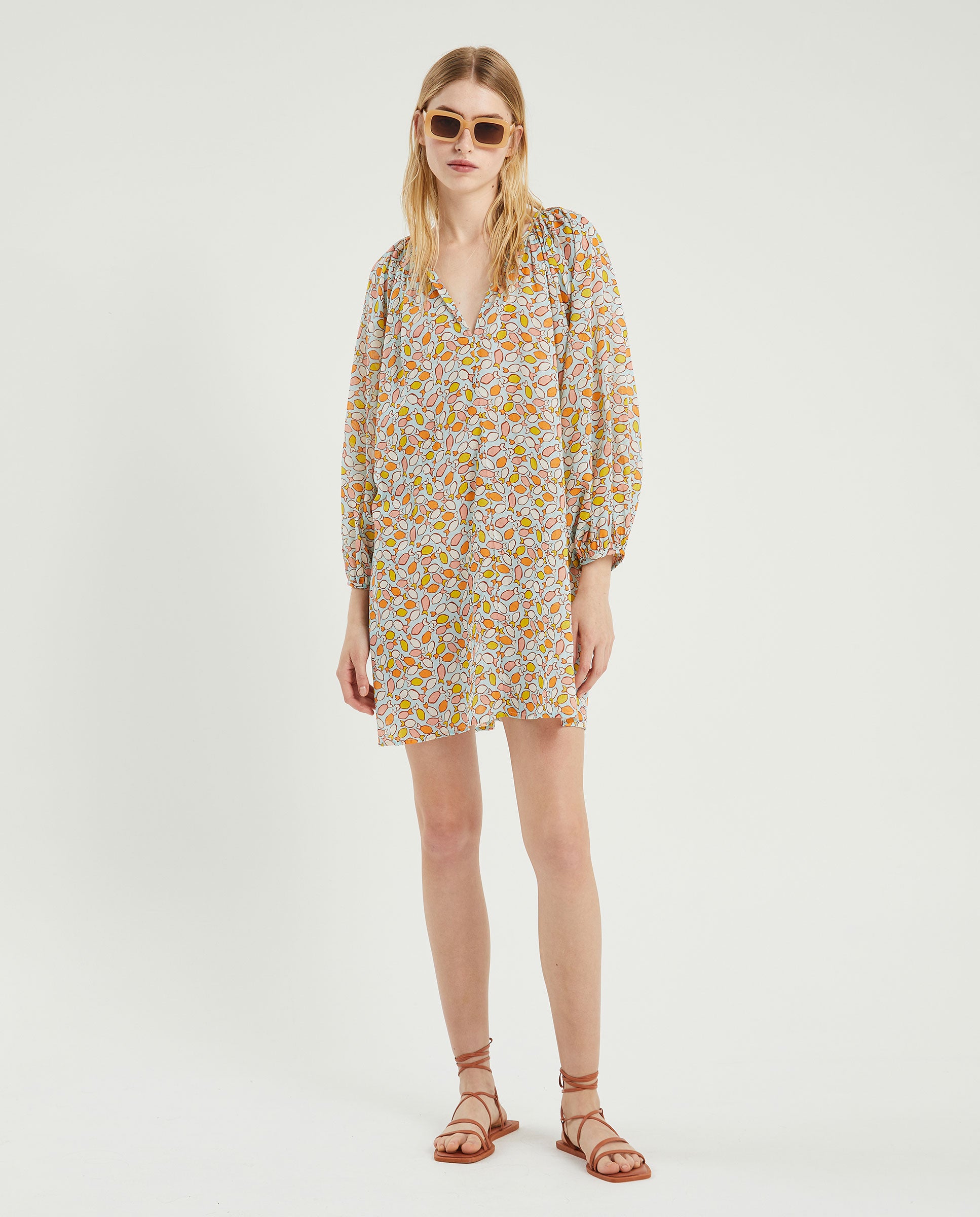 Vestido corto con estampado de limones en tonos naranjas, amarillos y rosados sobre fondo blanco. Diseño de corte amplio con escote en "V" y mangas largas abullonadas con puño elástico. Confeccionado en tela ligera y fluida, ideal para climas cálidos y looks frescos de verano.