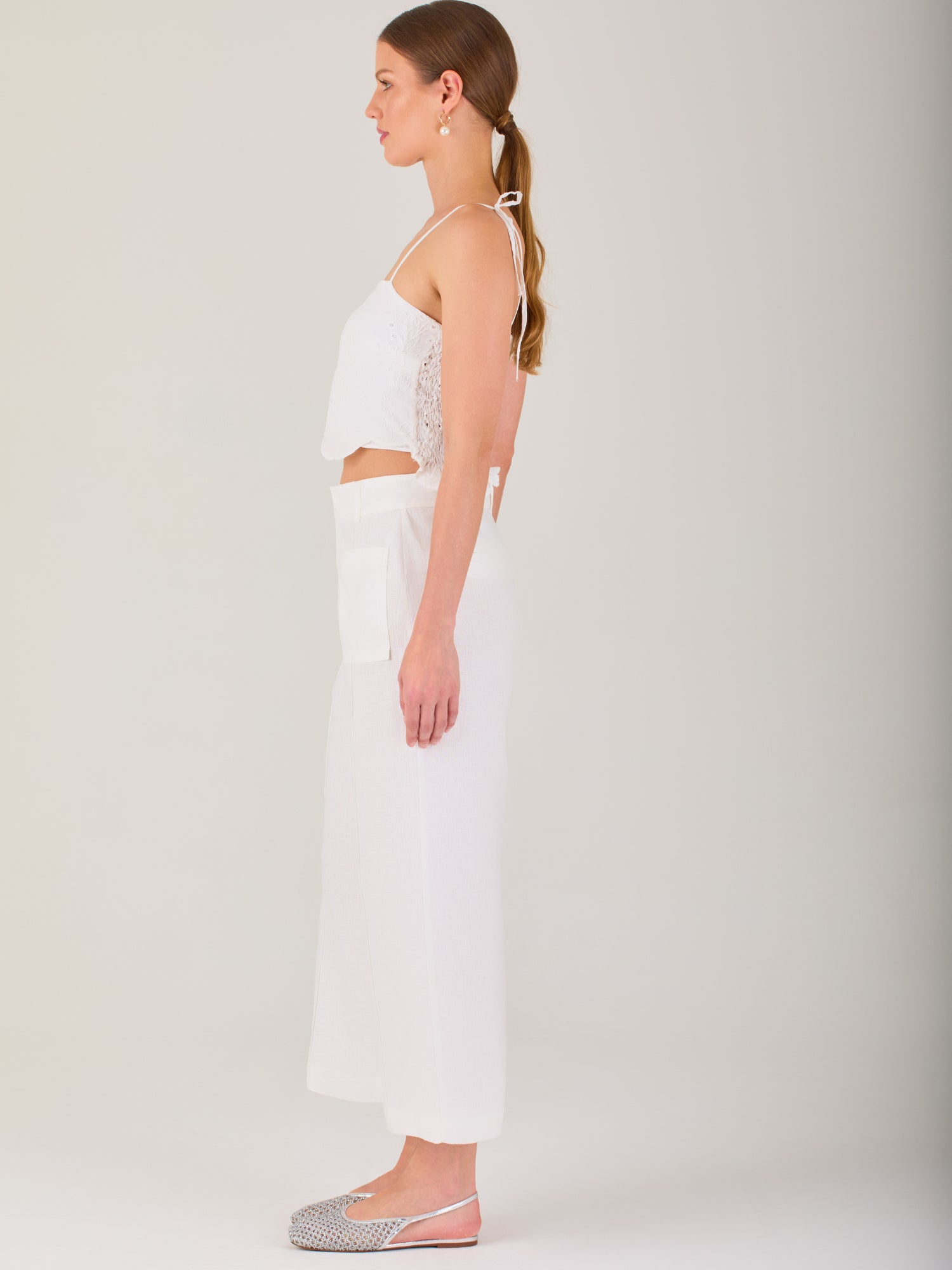 Pantalón blanco de corte recto y tiro alto, confeccionado en tela ligera con estructura suave. Diseño de pierna amplia tipo cropped que estiliza la silueta y brinda comodidad. Cuenta con bolsillos frontales funcionales y acabado limpio, ideal para looks frescos y elegantes. Perfecto para combinar con tops, blusas o sets coordinados.