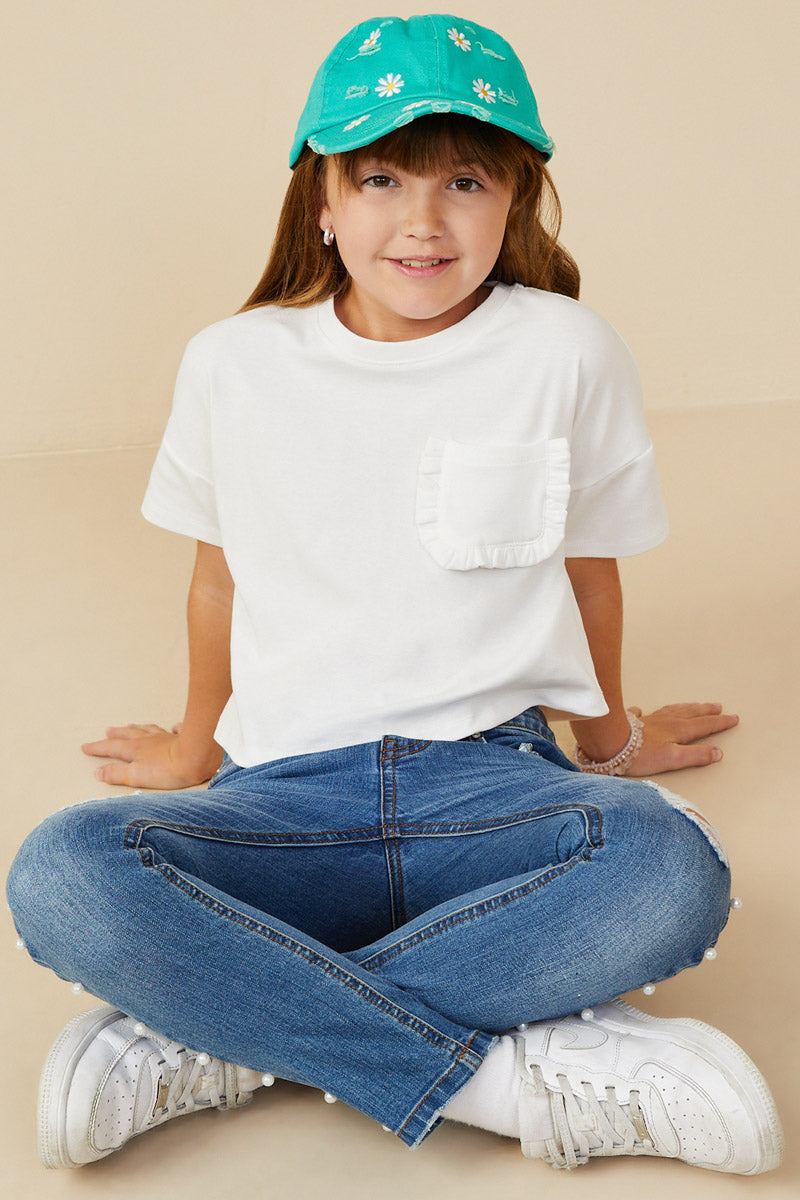 Blusa infantil en color blanco con diseño sencillo y versátil. Presenta cuello redondo, manga corta y un bolsillo frontal decorado con delicado detalle de olan alrededor, que le da un toque femenino y tierno. Confeccionada en tela ligera y fresca, ideal para combinar con jeans, faldas o shorts en looks casuales y cómodos.