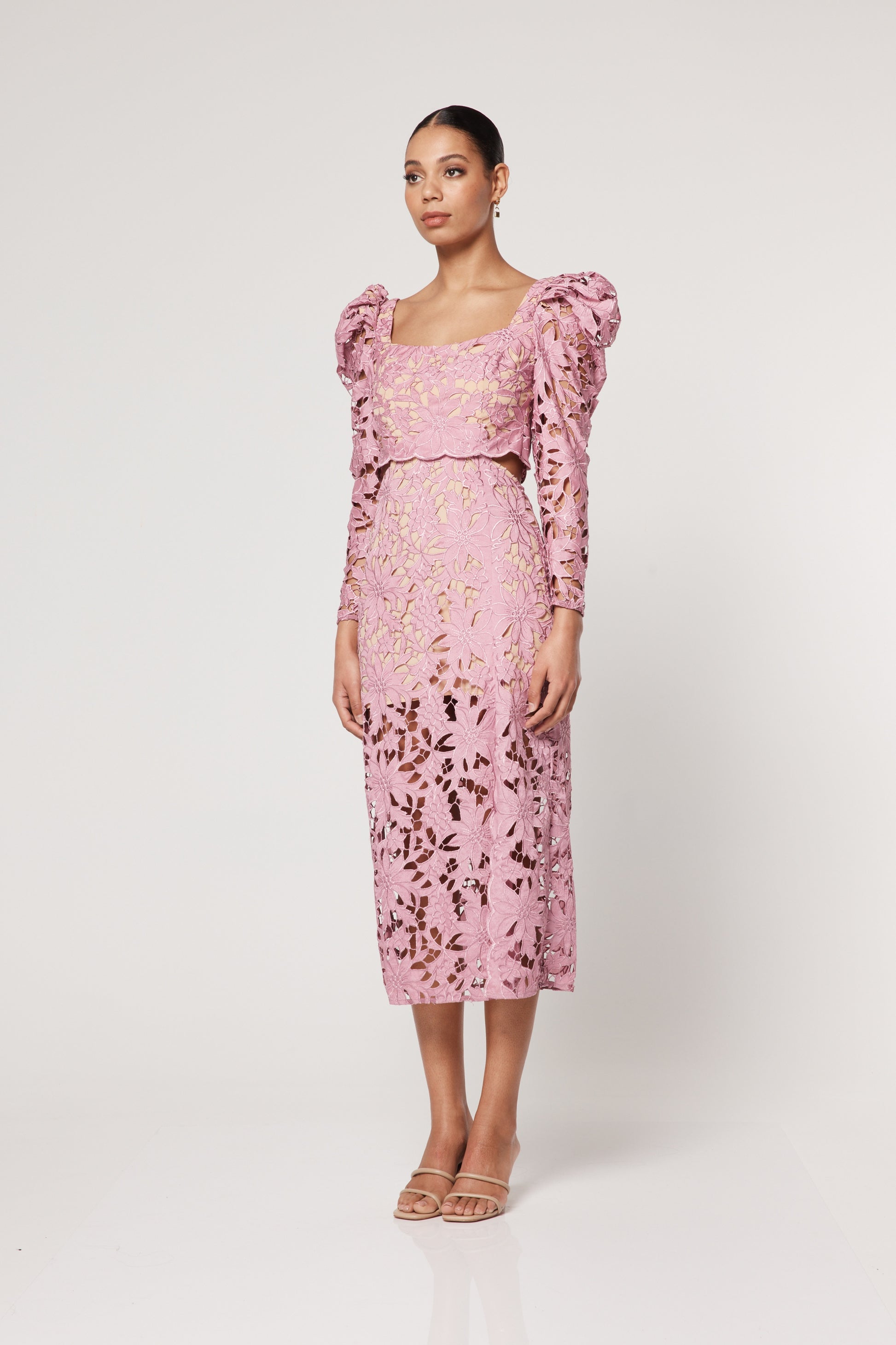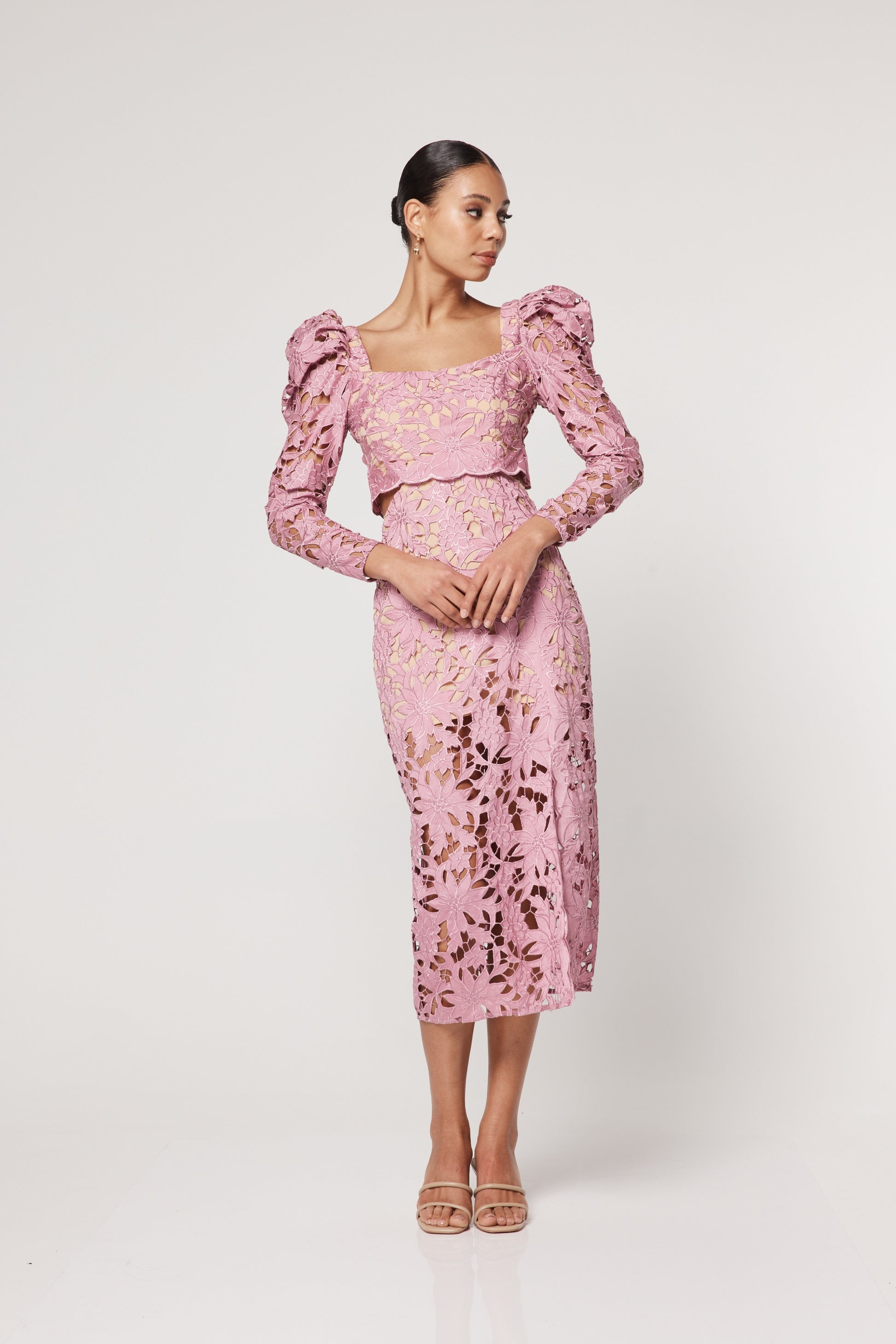 Romántico y sofisticado, este vestido midi confeccionado en delicado encaje floral rosa lila es perfecto para ocasiones especiales. Presenta escote cuadrado, mangas largas abullonadas con volumen estructurado, y un favorecedor corte ceñido al cuerpo. El diseño incluye una pequeña abertura frontal y detalles calados que revelan con sutileza el forro nude interior, aportando un contraste moderno y femenino. Su silueta alarga la figura y resalta con elegancia.