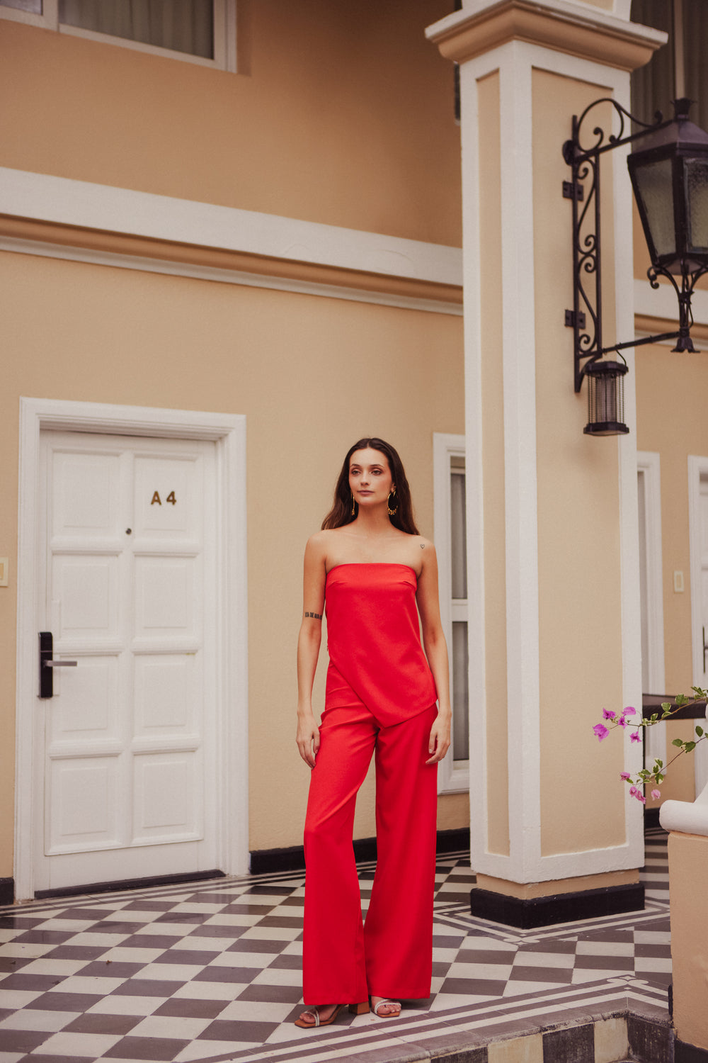 Set rojo vibrante compuesto por un top strapless de caída fluida y silueta asimétrica, y pantalón palazzo de tiro alto y corte amplio. Confeccionado en tela satinada con ligero brillo, es ideal para ocasiones donde se busca un look sofisticado y moderno sin sacrificar comodidad. Perfecto para eventos de tarde o noche con un toque chic y audaz.