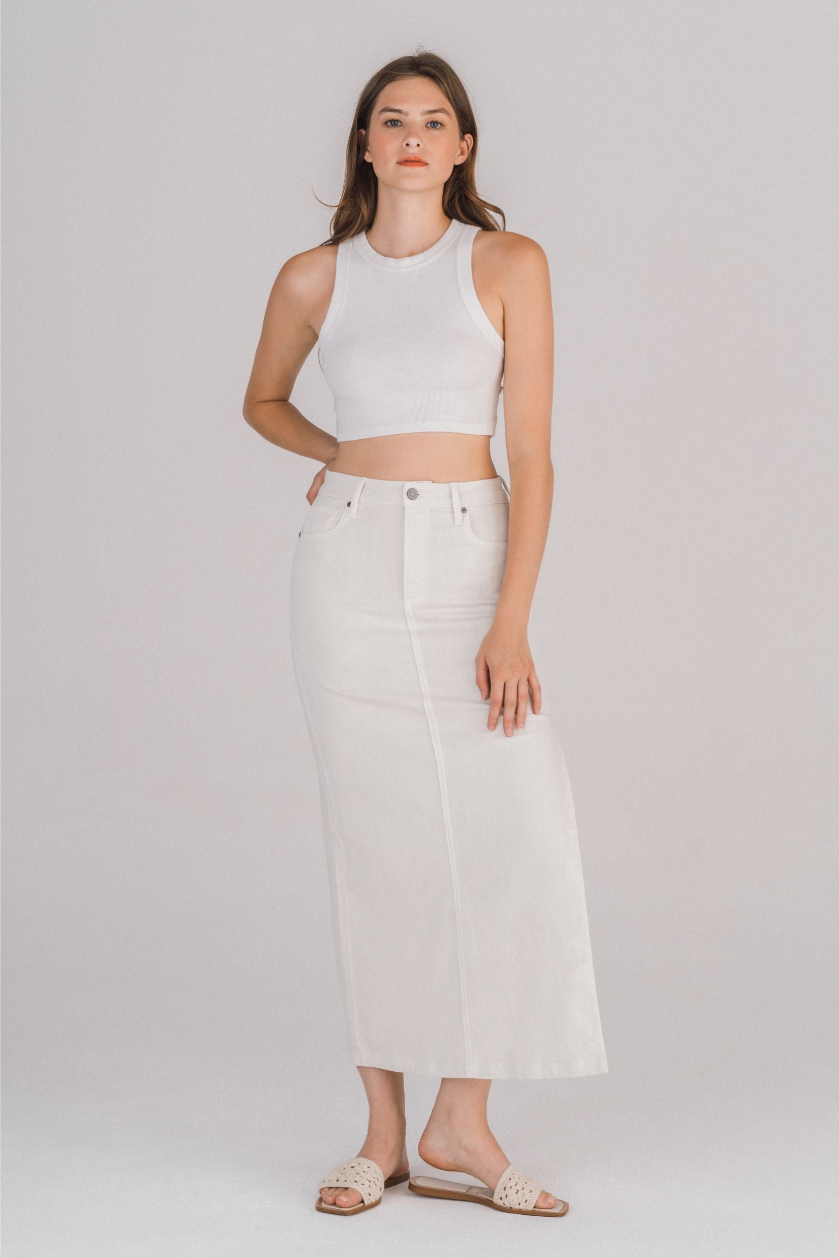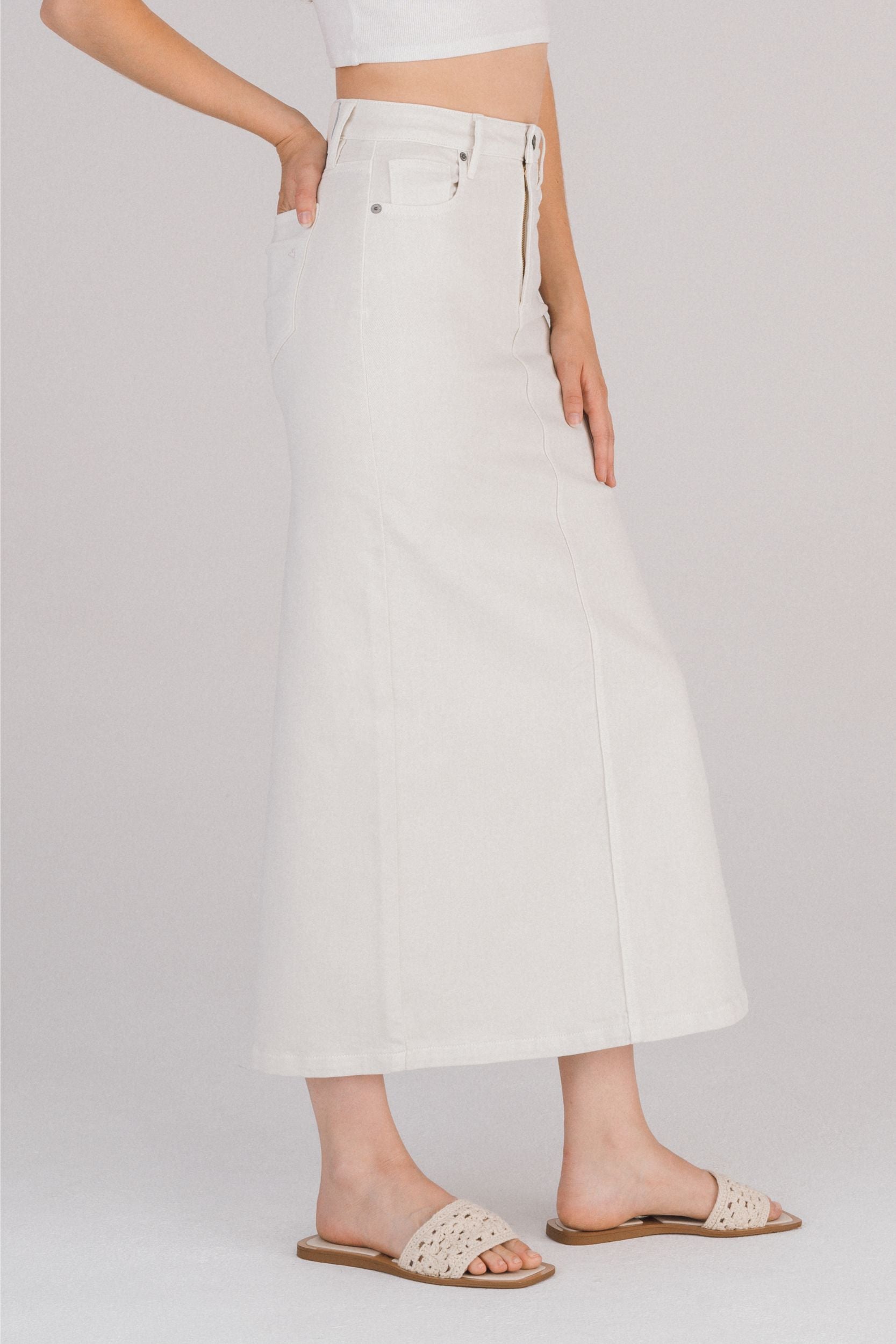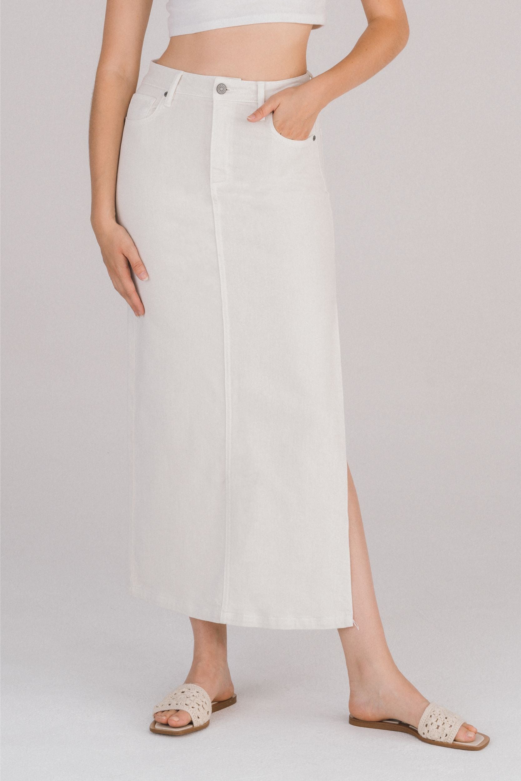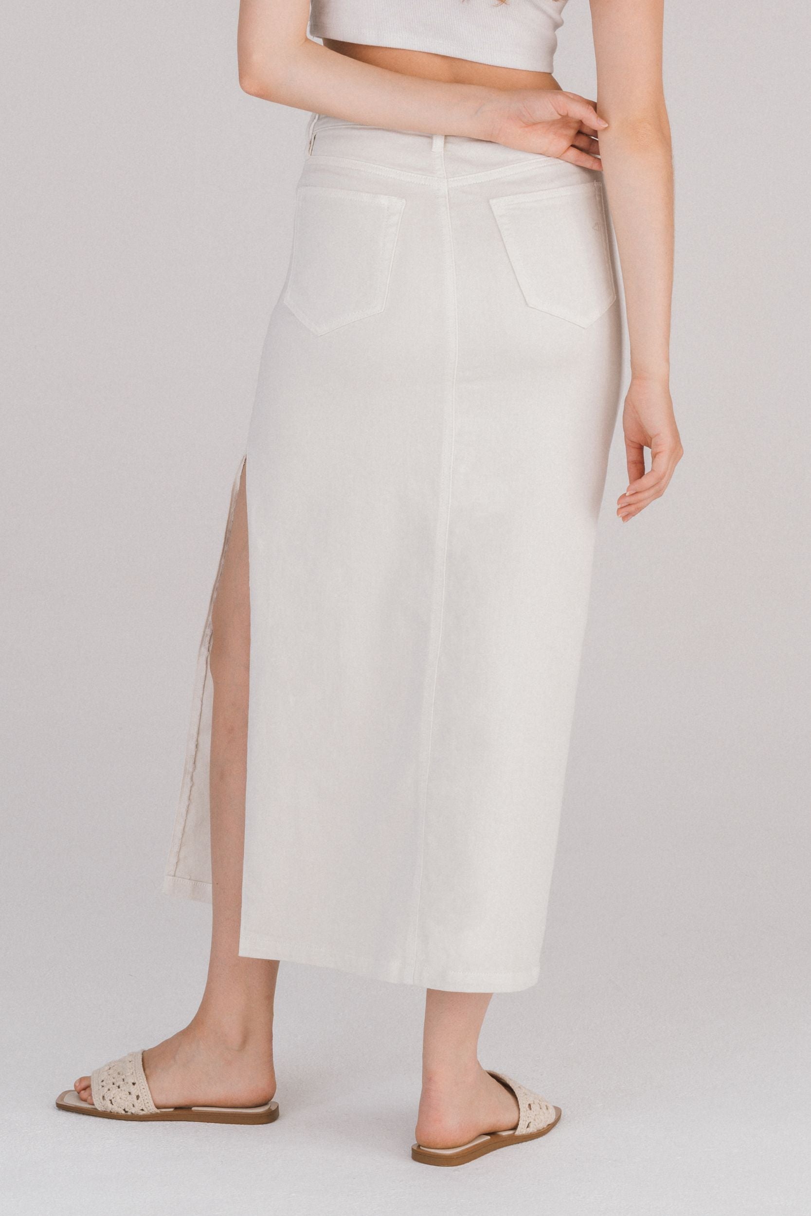 Falda midi blanca de mezclilla con abertura lateral. Corte recto de tiro alto, con bolsillos y costura frontal visible. Confeccionada en denim suave con ligera elasticidad. Versátil y fresca, perfecta para looks de día o verano.