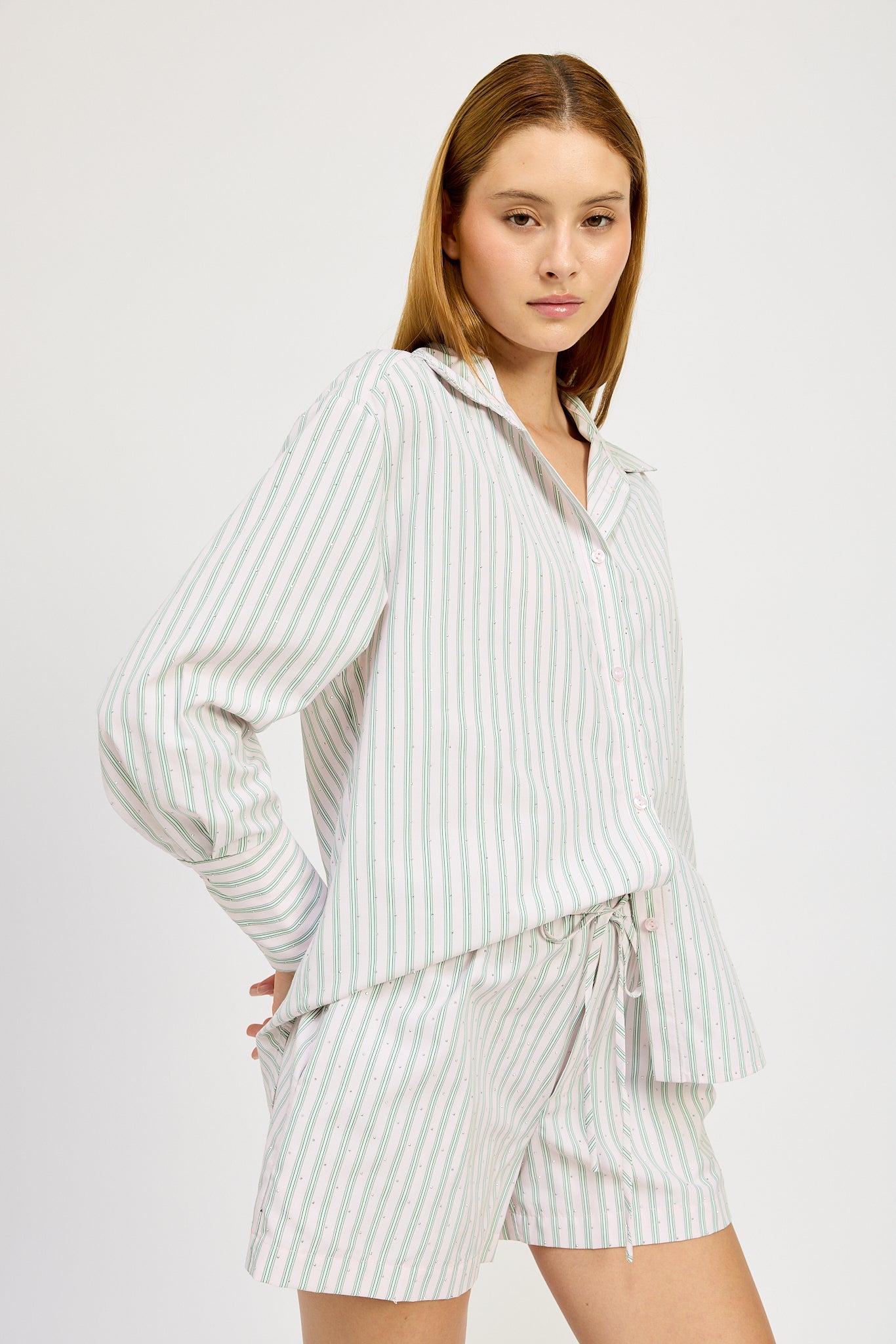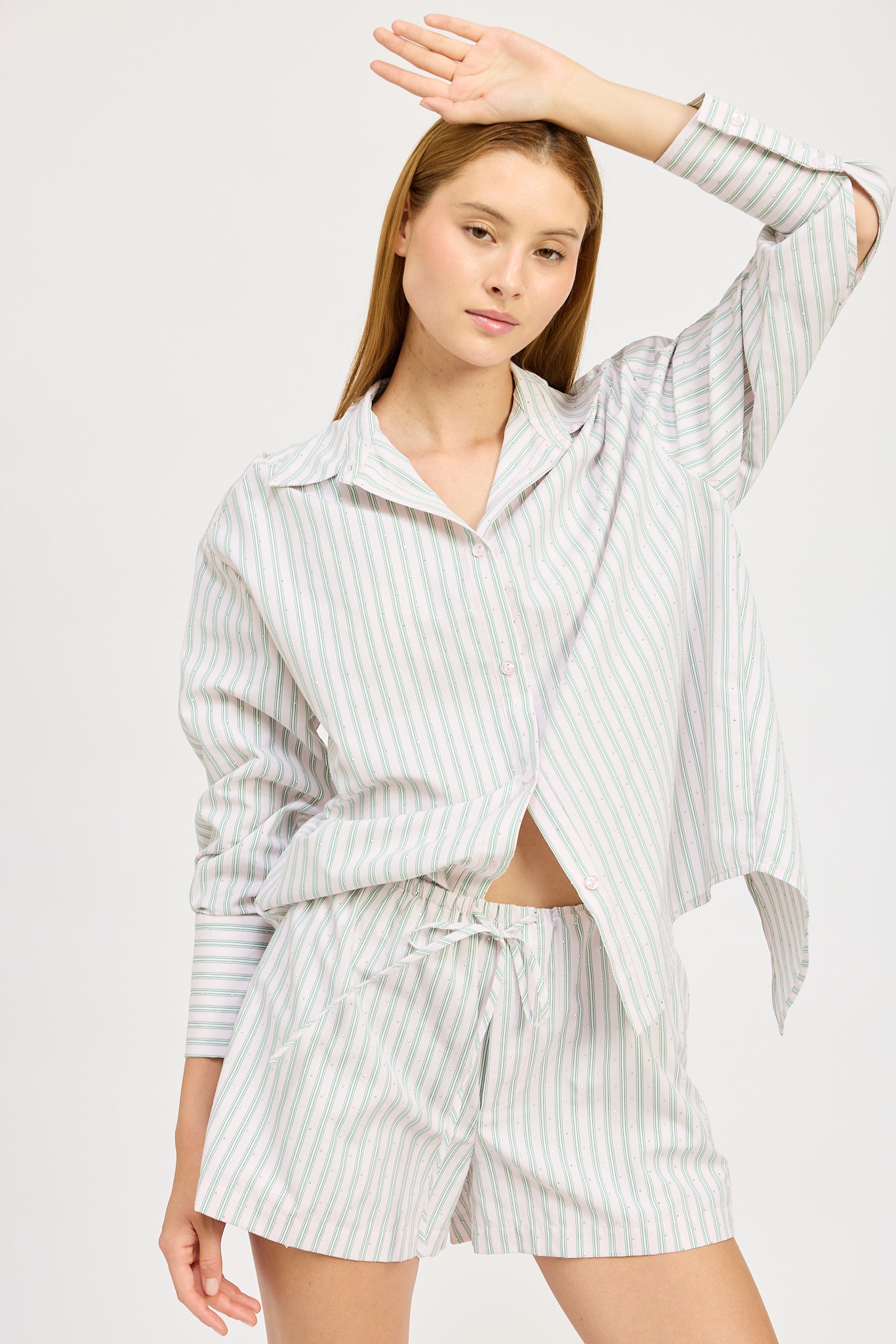 Camisa de corte clásico con cuello solapa, confeccionada en tejido blanco con rayas verticales en verde y detalles de pequeños brillos distribuidos en toda la prenda. De diseño liviano y fluido, cuenta con botones frontales a tono, ideal para looks relajados pero con un toque chic gracias al sutil destello que aporta elegancia sin esfuerzo.
