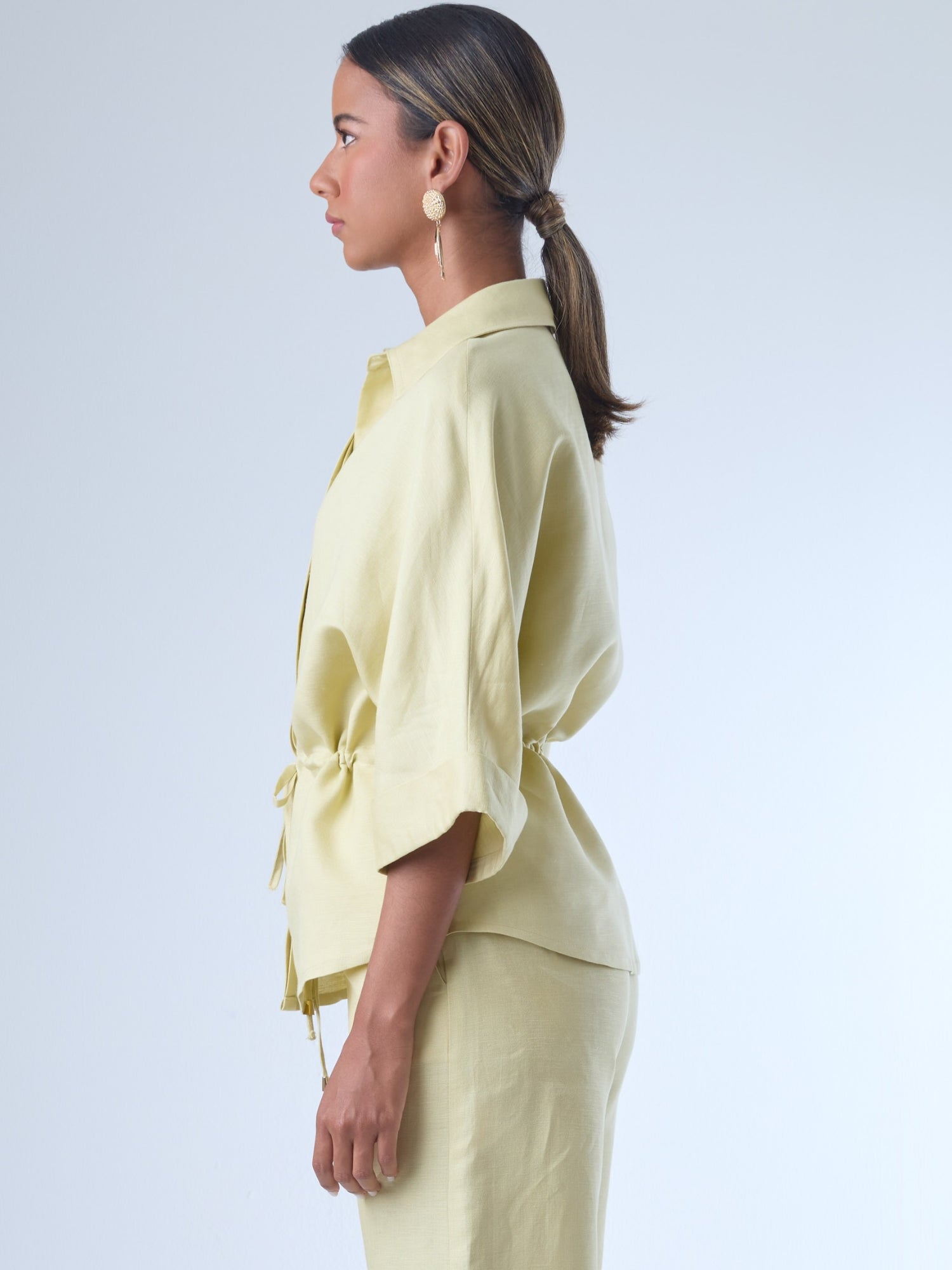Blusa elegante en tono verde suave, de diseño tipo camisa con cuello clásico y mangas amplias tres cuartos. Confeccionada en tejido ligero de caída fluida, ofrece un ajuste cómodo y fresco. Incorpora cordón ajustable en la cintura que permite definir la silueta de forma delicada. Ideal para looks casuales elegantes o conjuntos formales relajados.