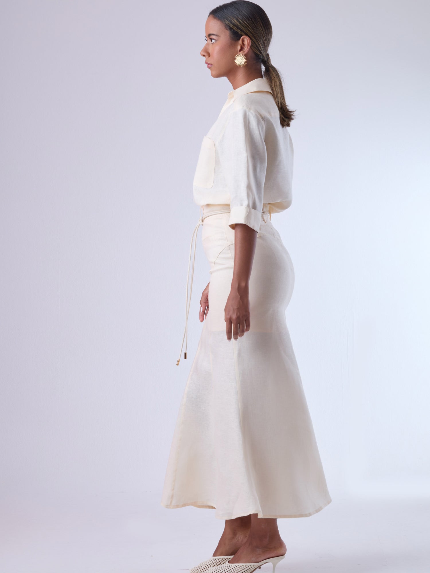 Falda larga elegante en tono sand, de silueta recta con ligera amplitud en el bajo. Confeccionada en tejido ligero de acabado natural, ofrece una caída fluida y sofisticada. Incorpora cinturón del mismo material con hebilla decorativa que define la cintura y estiliza la figura. Ideal para looks formales, conjuntos de oficina o combinaciones elegantes de día.