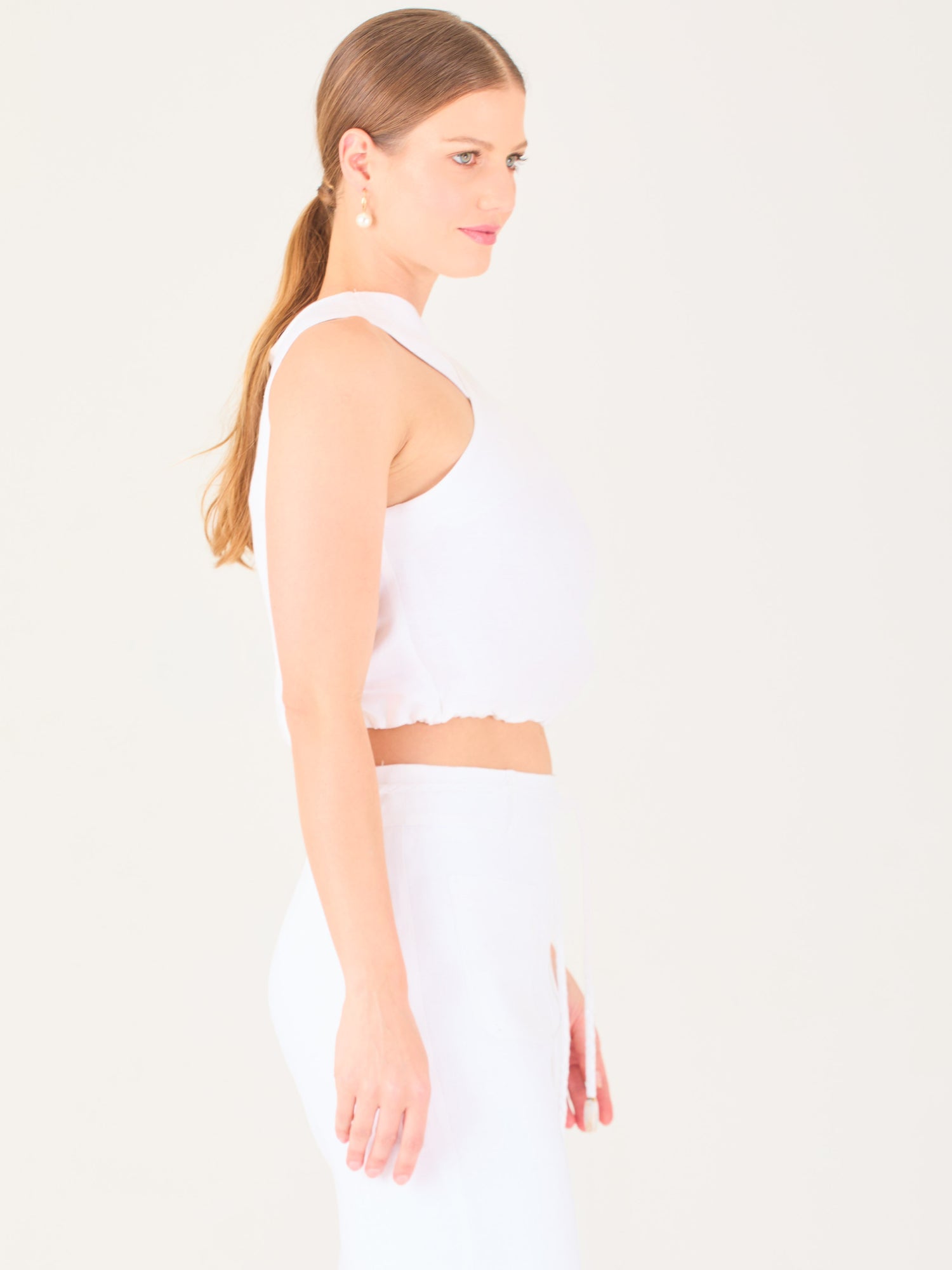 Blusa corta sin mangas con escote cruzado tipo halter que estiliza el cuello y los hombros. Confeccionada en tela ligera y fresca de color blanco, con acabado delicado en el ruedo inferior. Su diseño minimalista la hace ideal para combinar con pantalones de tiro alto o faldas, perfecta para looks elegantes o casuales.