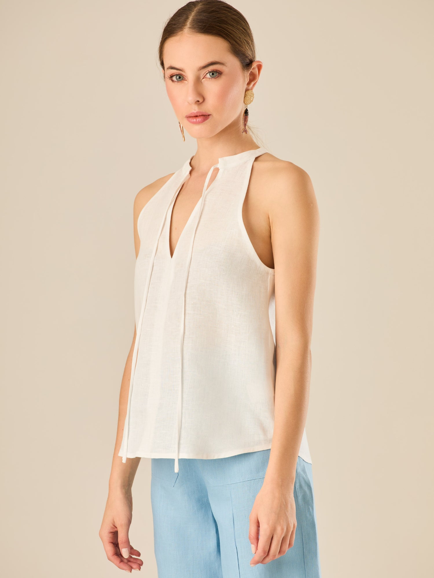 Blusa sin mangas con escote en V y cuello tipo halter, de silueta recta y caída fluida. Confeccionada en tela ligera y fresca de color blanco, con delicado detalle de abertura frontal que aporta elegancia. Ideal para looks formales o casuales, fácil de combinar con pantalones o faldas.