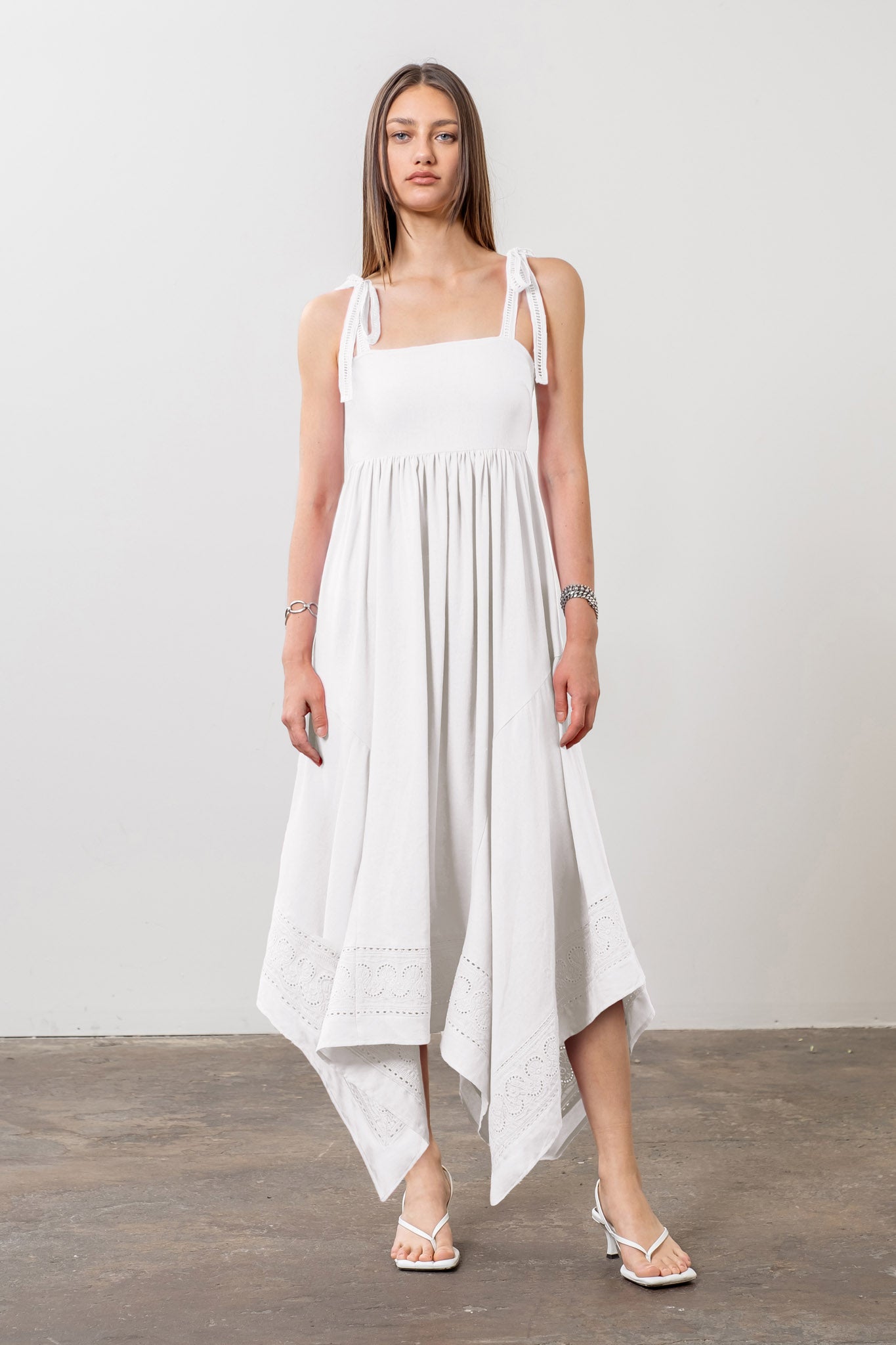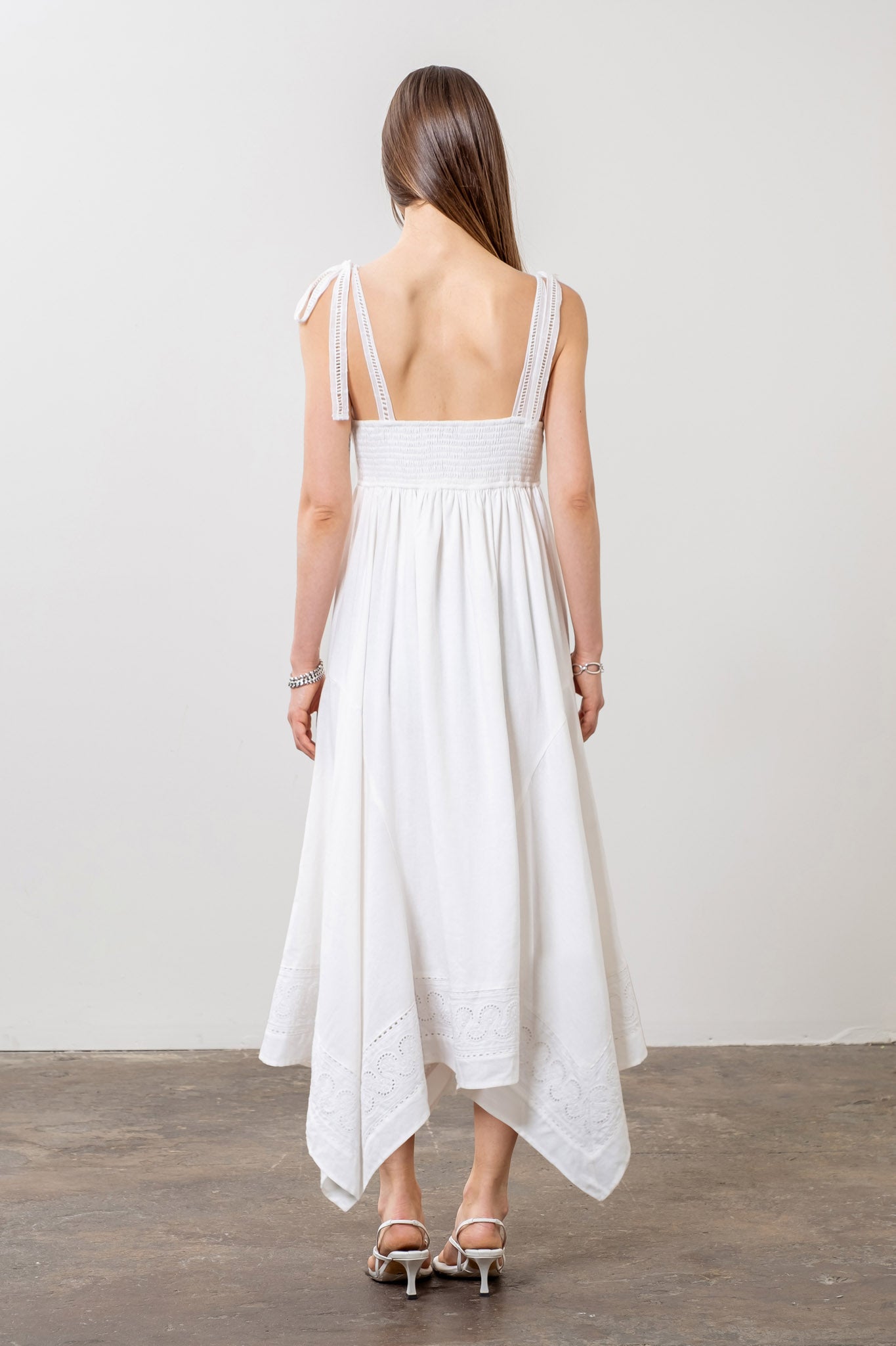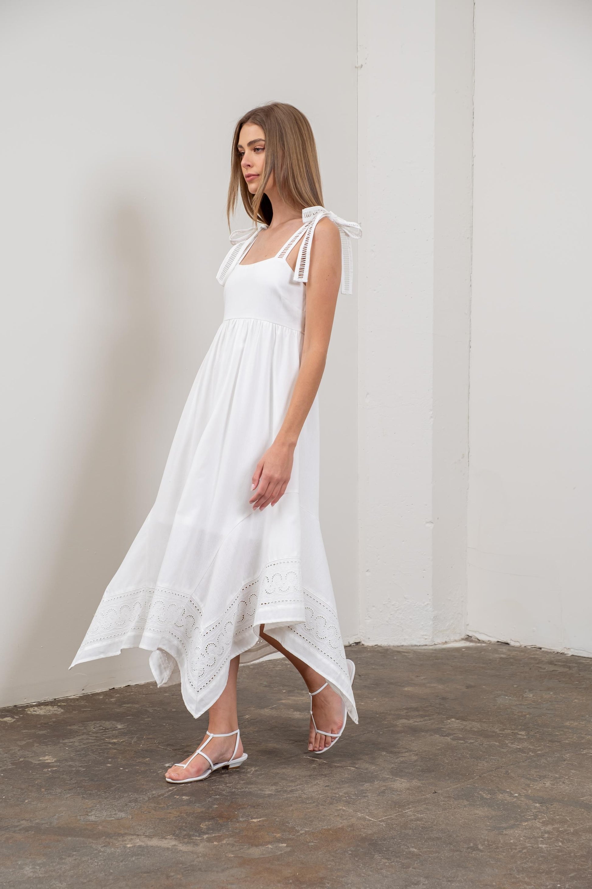 Vestido blanco de largo midi con tirantes ajustables anudados en los hombros. Diseño con escote cuadrado, cuerpo ajustado y falda amplia con caída fluida. El ruedo termina en picos con detalle de bordado inglés que aporta un toque artesanal. Confeccionado en algodón liviano. Composición estimada: 100% algodón.