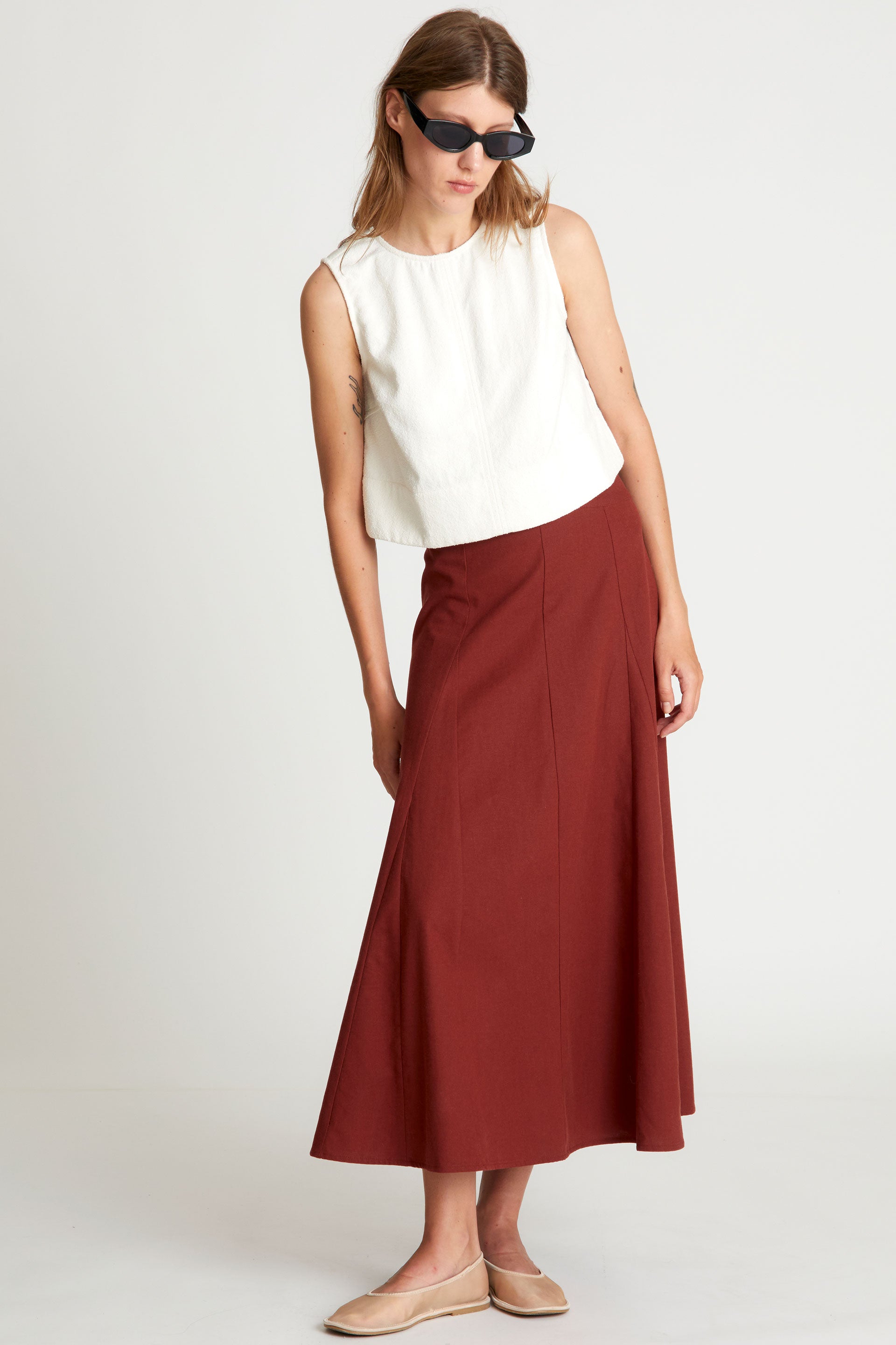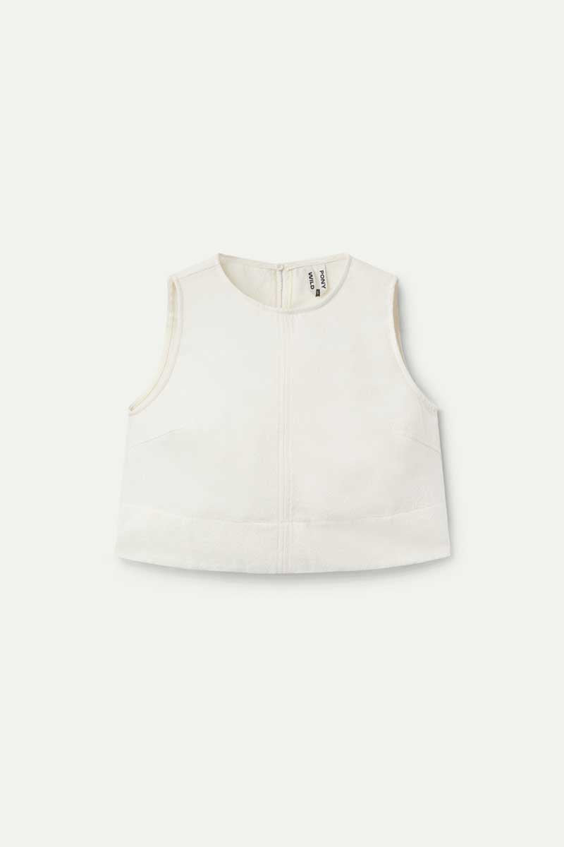 Blusa sin mangas en tono crudo, con corte recto y escote redondo. Diseño minimalista y moderno, confeccionado en tejido de textura suave tipo crepé. Ideal para combinar en conjuntos o usar sola. Composición estimada: mezcla de algodón y poliéster.