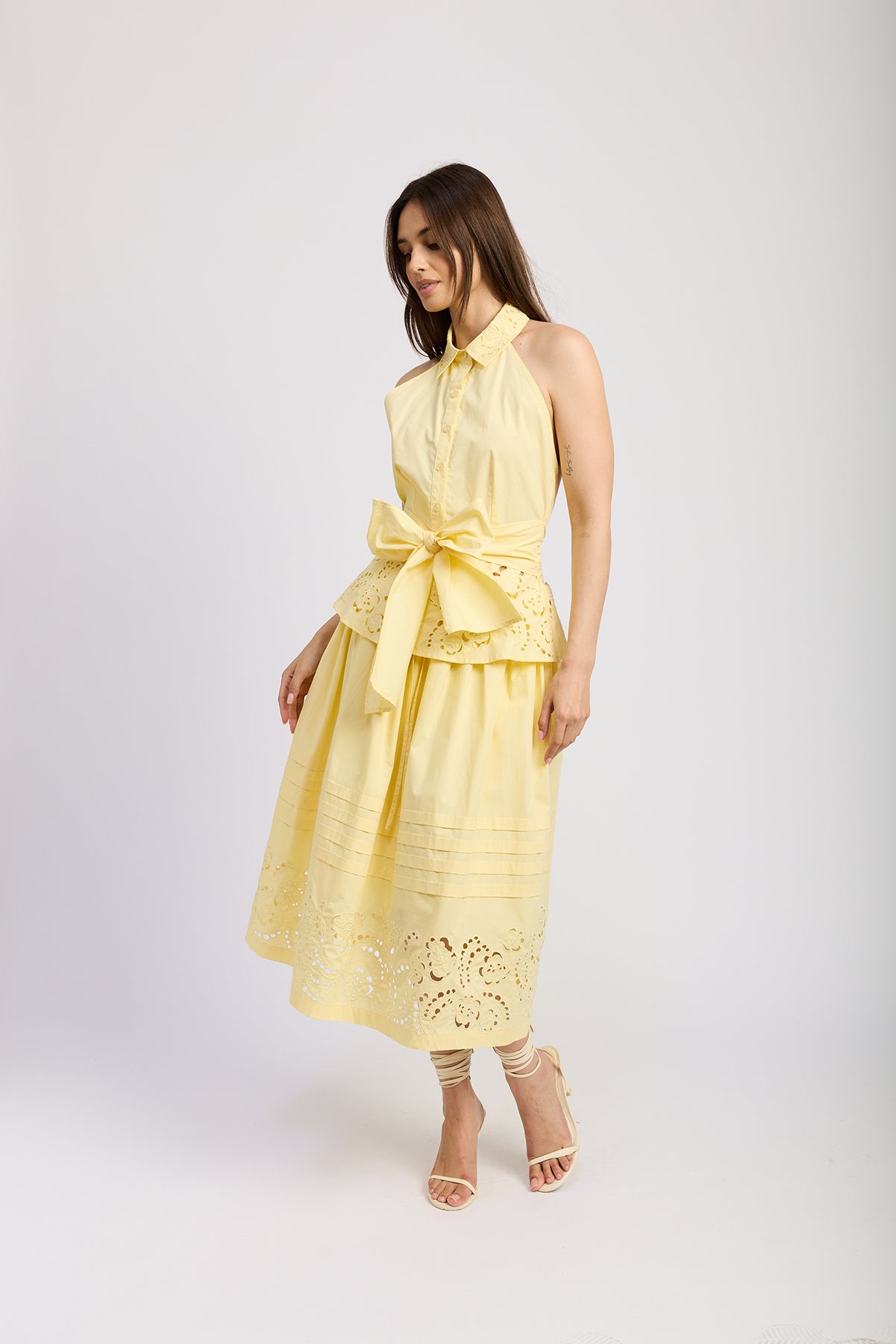 Blusa sin mangas en tono amarillo pastel con cuello camisero y cierre frontal de botones. Presenta diseño halter que estiliza los hombros y detalle de moño ancho en la cintura para acentuar la silueta. Incluye bordados calados florales en el borde inferior, aportando un aire femenino y veraniego.